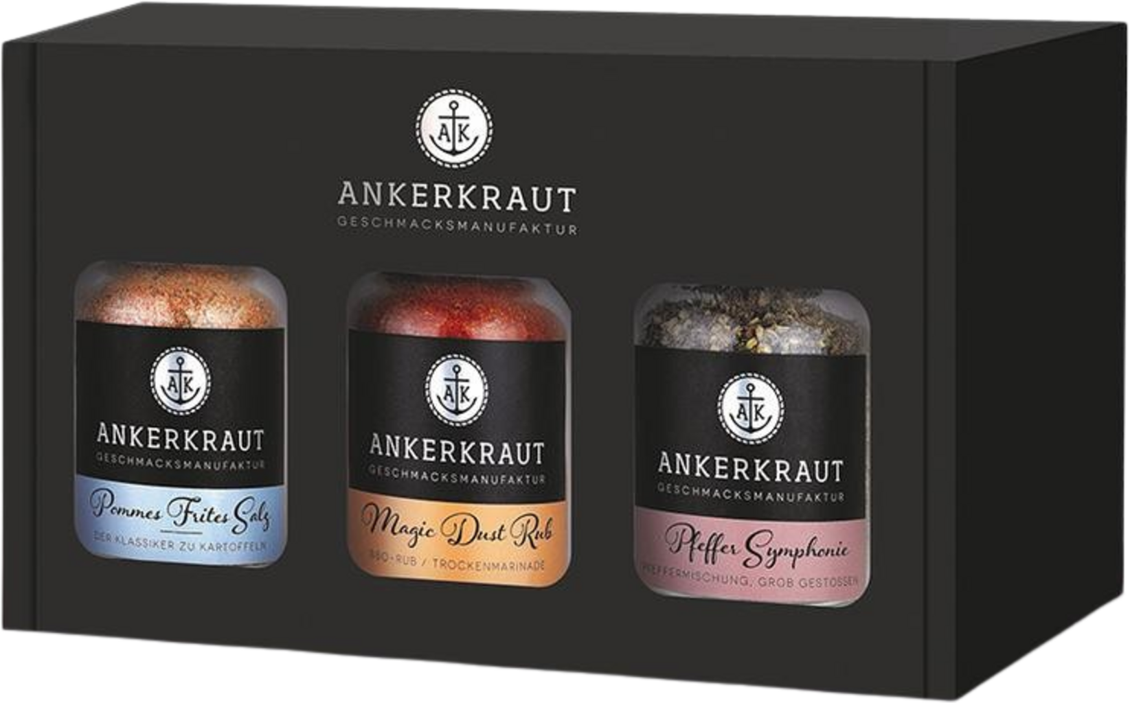 Drei Gewürzmischungen, die man einfach immer im Haus haben sollte: Salz, Pfeffer und Grill-Rub. Die Best of 3er Box von Ankerkraut ist somit bestimmt ein gern gesehenes Geschenk!