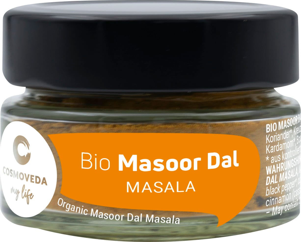 COSMOVEDA Bio Masoor Dal Masala ist eine speziell abgestimmte Gewürzmischung aus ayurvedischen Gewürzen, das köstliche Gerichte aus roten Linsen (Masoor Dal) gelingen lässt.