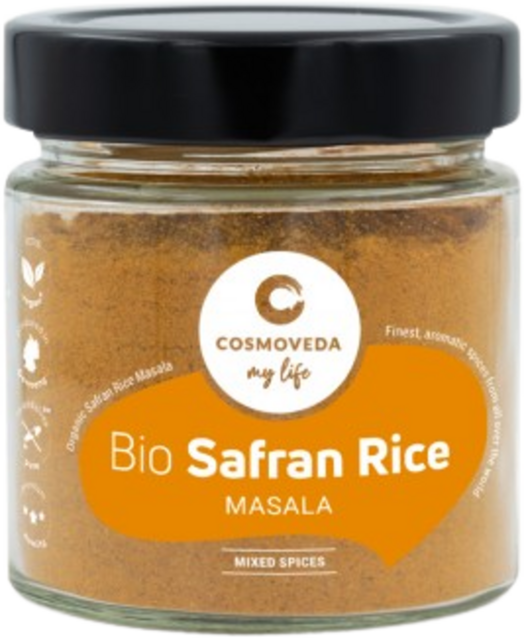 COSMOVEDA BIO Safran Rice Masala ist eine spezielle ayurvedische Mischung erlesener Gewürze, die Ihnen einen köstlichen Safran Reis zaubern lässt.