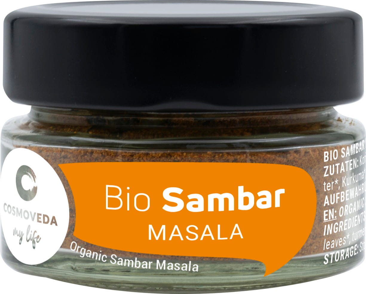 COSMOVEDA BIO Sambar Masala, eine speziell abgestimmte ayurvedische Mischung erlesener Gewürze, die Ihnen ein köstliches Sambar gelingen lässt.