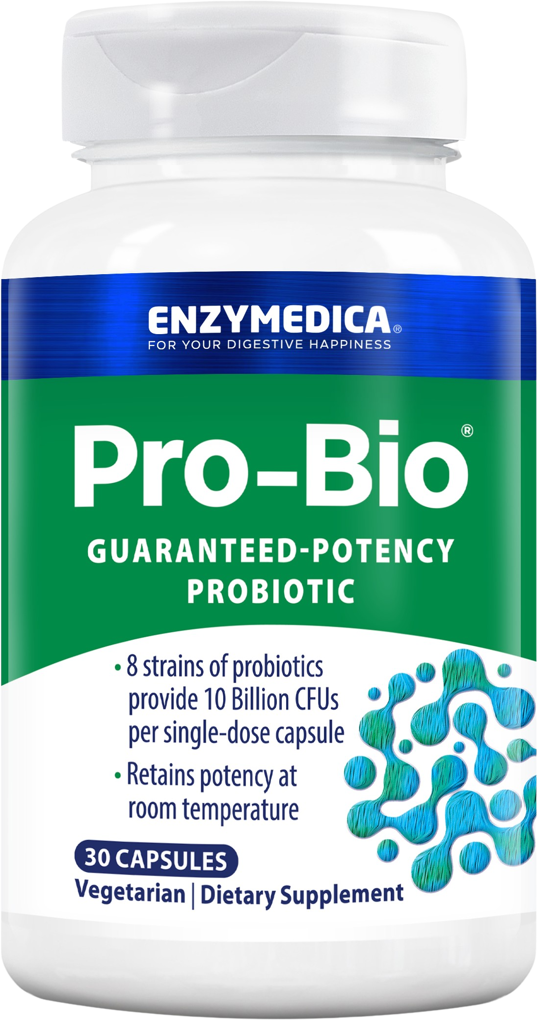 Pro-Bio™ enthält eine Probiotische Mischung mit 10 Billionen CFU pro Tagesdosis in magensaftresistenten Kapselhülle.