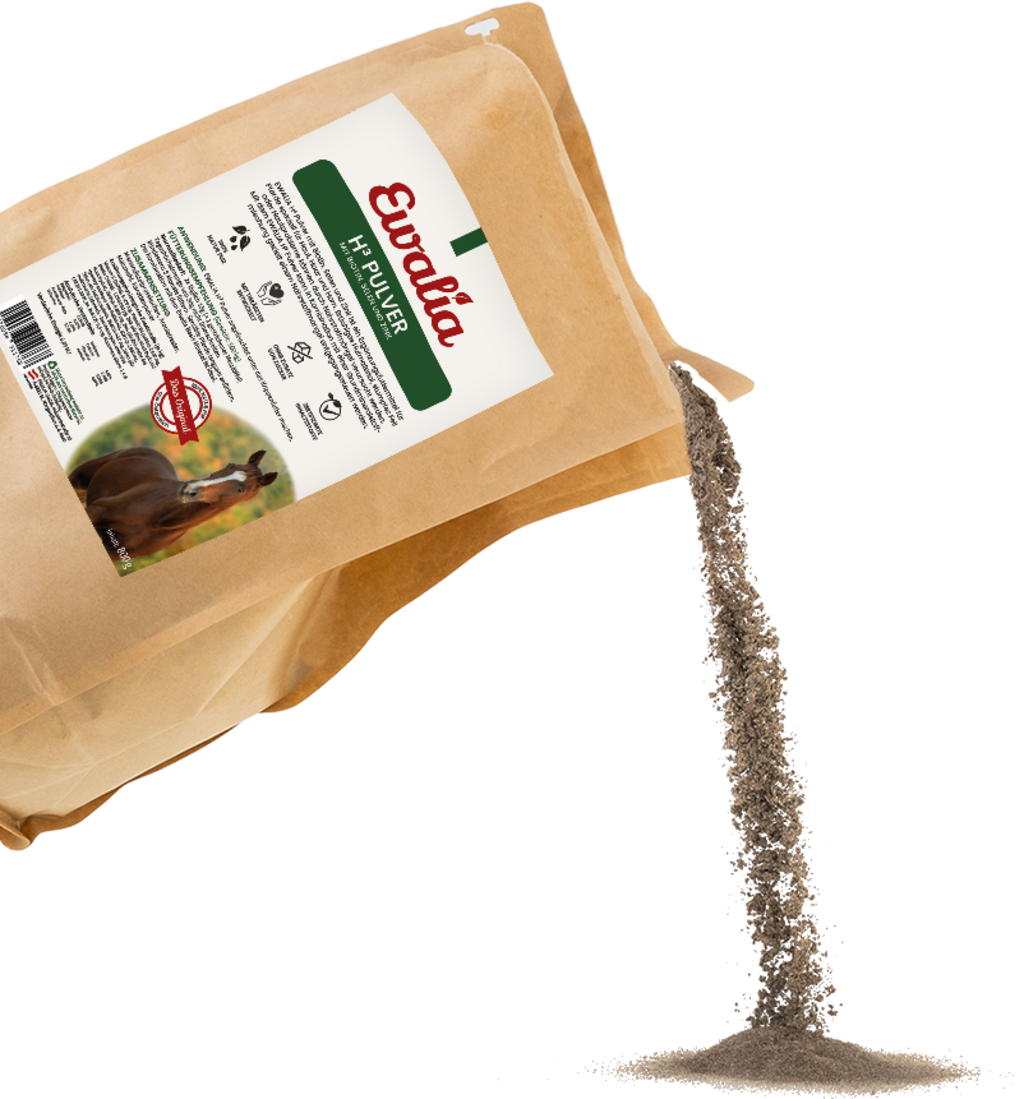Das H³ Pulver wurde speziell zur Unterstützung von Haut, Haar und Horn entwickelt. Ein Nährstoffmangel kann brüchiges Hufmaterial, stumpfes Fell oder Hautprobleme zur Folge haben. Das H³ Pulver liefert dem Pferd Biotin, Selen und Zink und kann in Kombination mit einer Grundmineralstoffmischung einem Nährstoffmangel entgegenwirken.