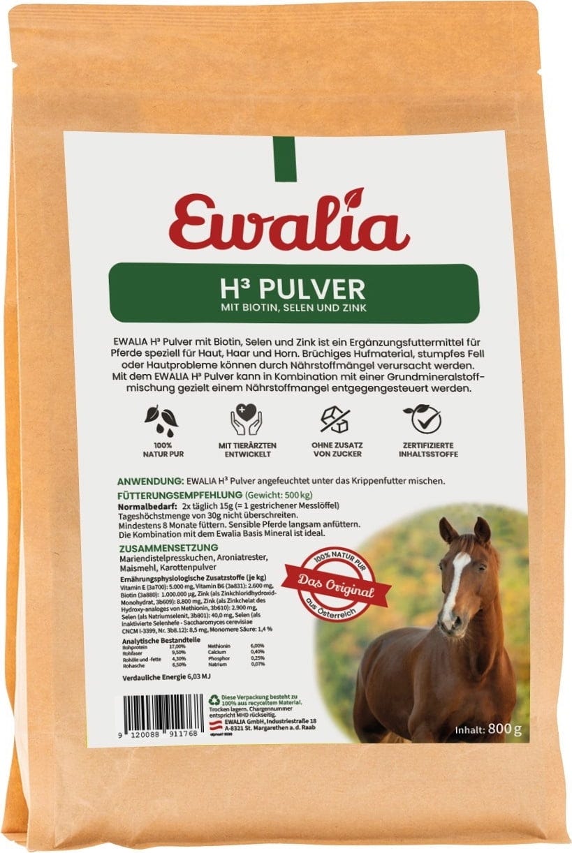 Das H³ Pulver wurde speziell zur Unterstützung von Haut, Haar und Horn entwickelt. Ein Nährstoffmangel kann brüchiges Hufmaterial, stumpfes Fell oder Hautprobleme zur Folge haben. Das H³ Pulver liefert dem Pferd Biotin, Selen und Zink und kann in Kombination mit einer Grundmineralstoffmischung einem Nährstoffmangel entgegenwirken.