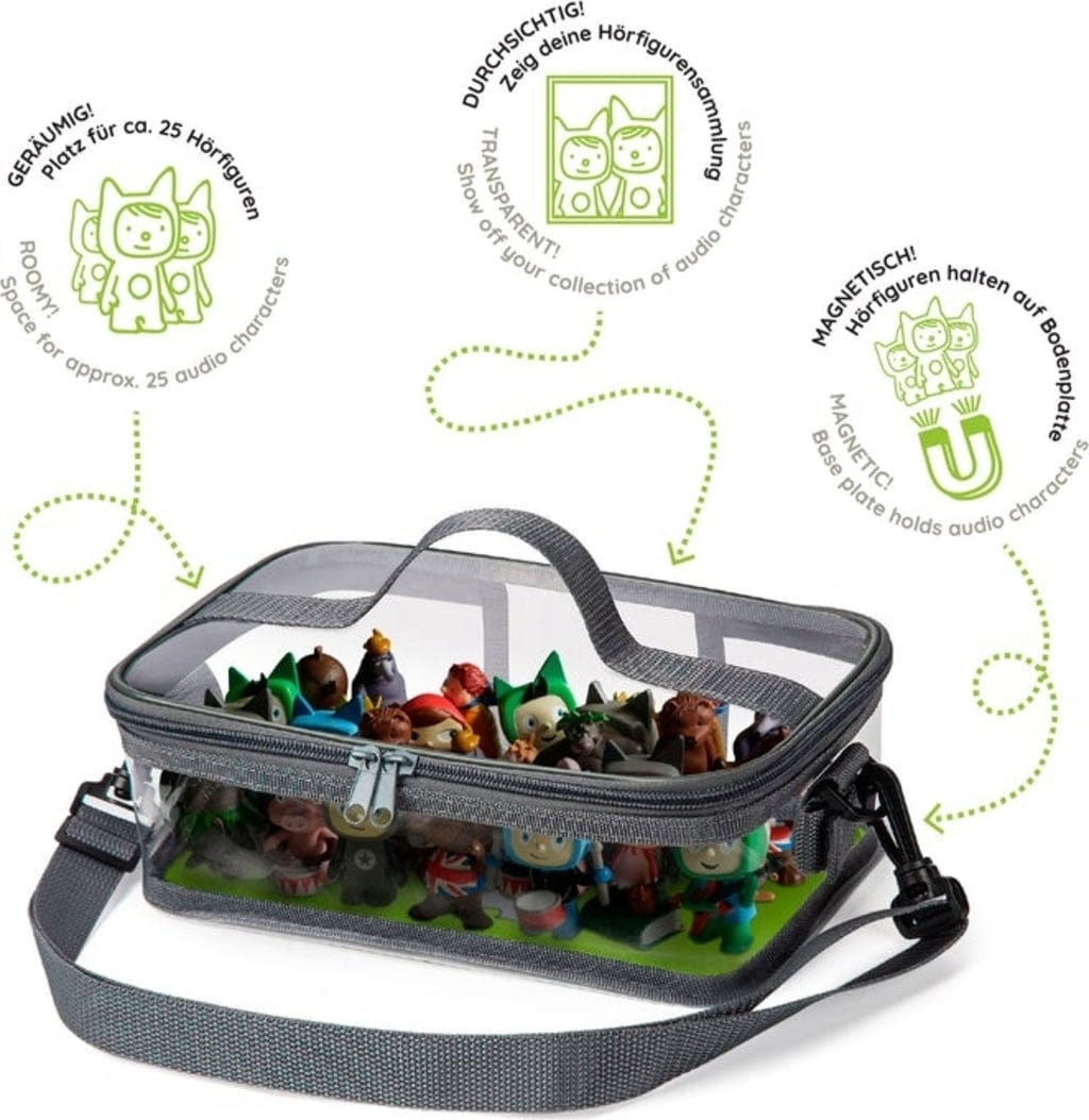 Bis zu 30 Toniefiguren können in dieser weichen Tasche verstaut und sicher transportiert werden. Dank der transparenten Seiten hast du deine Sammlung immer gut im Blick. Außerdem findest du gesuchte Figuren viel schneller. Der Magnetboden sorgt dafür, dass kein Durcheinander entsteht. Die Hörfigur Tasche kann auch mit wenigen Handgriffen als Aufsatz mit der Fantifant Musikbox Tasche kombiniert werden.