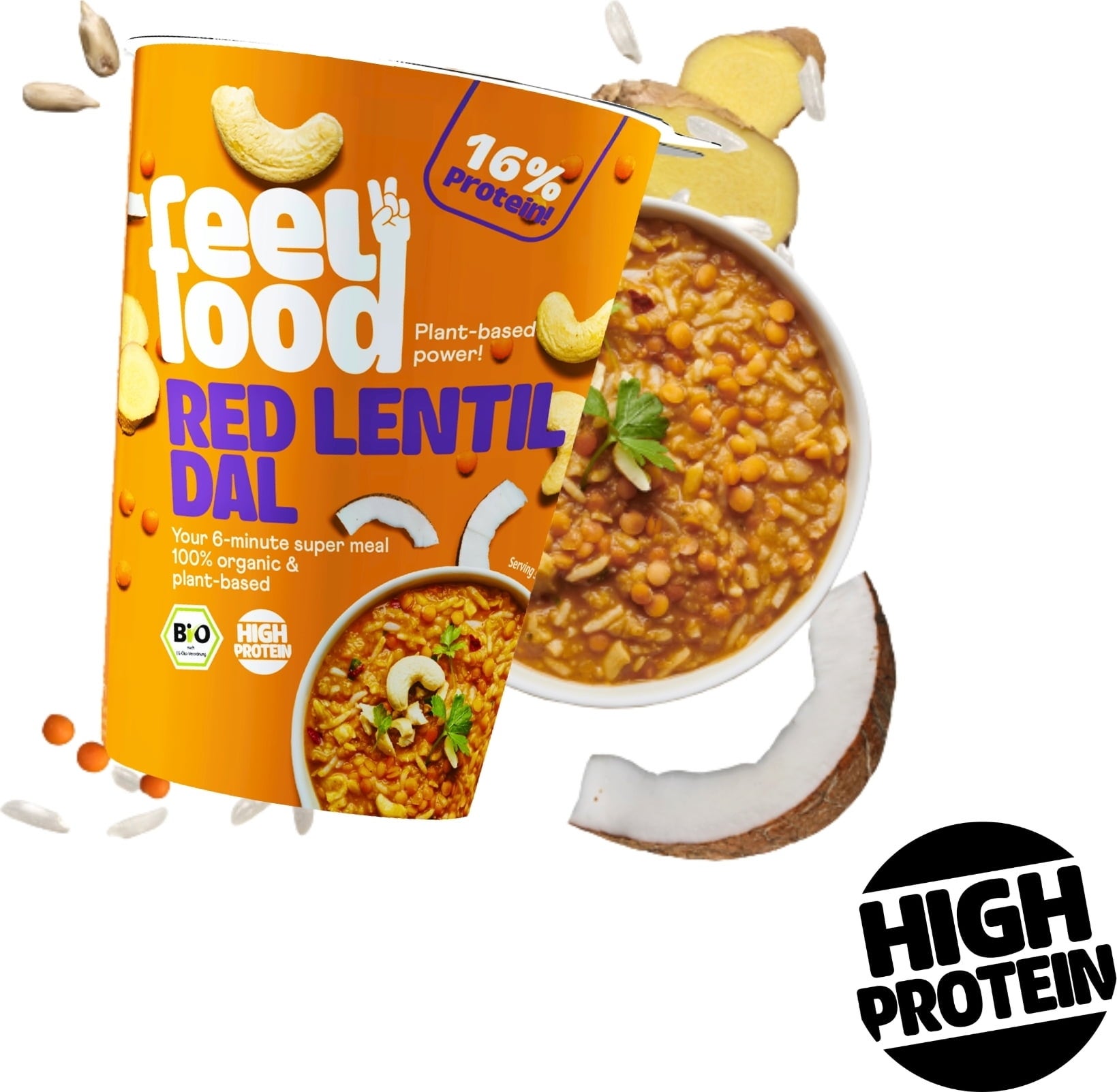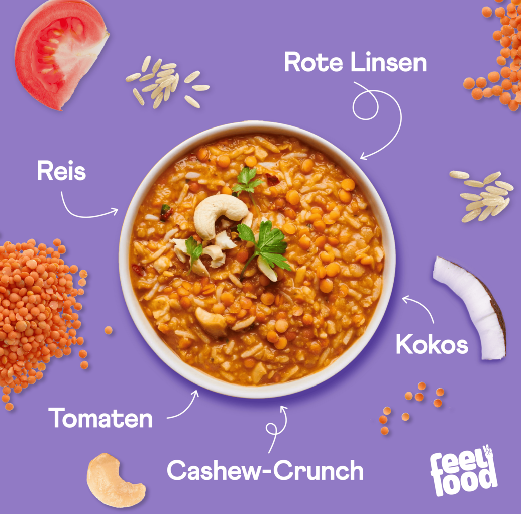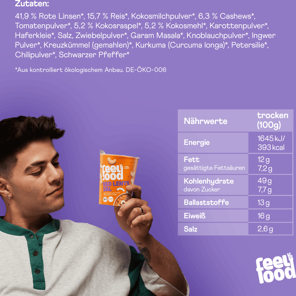 Doch hier der Clou – statt stundenlanges Köcheln bekommst du mit feelfood® Red Lentil Dal das Beste in Bio-Qualität und instant! Eine Extraportion rote Linsen mit cremiger Kokosmilch, Tomaten, Reis, aromatischen Gewürzen und geröstetem Cashew-Crunch. Ein Super Lunch, der selbst hartgesottene Linsen-Nein-Sager*innen überzeugt. Cremig, authentisch indisch und suuuper tasty!