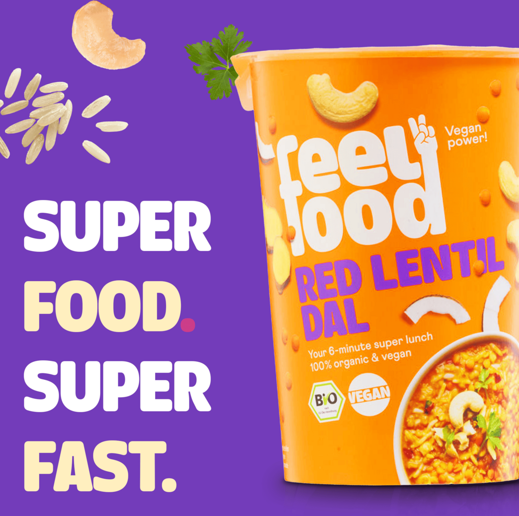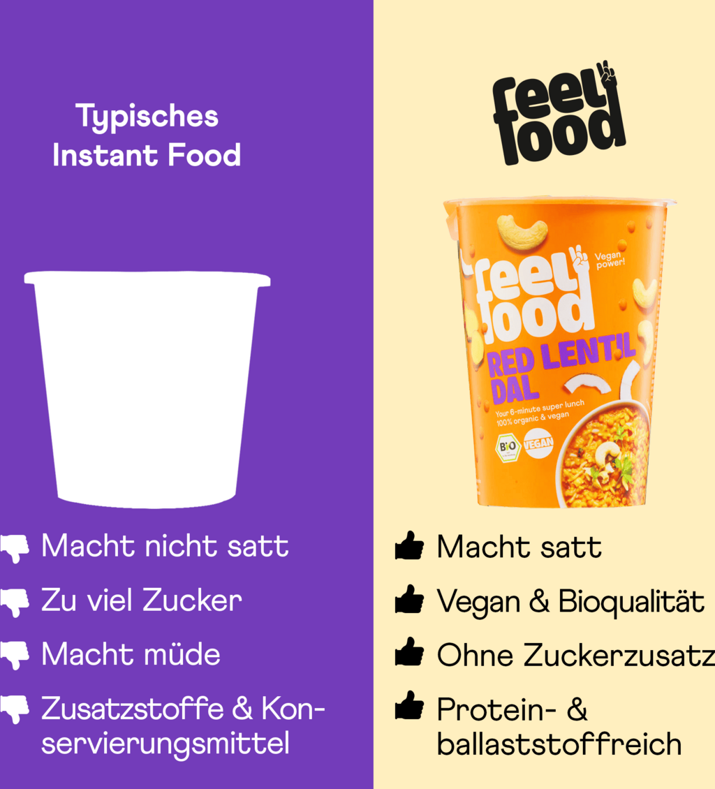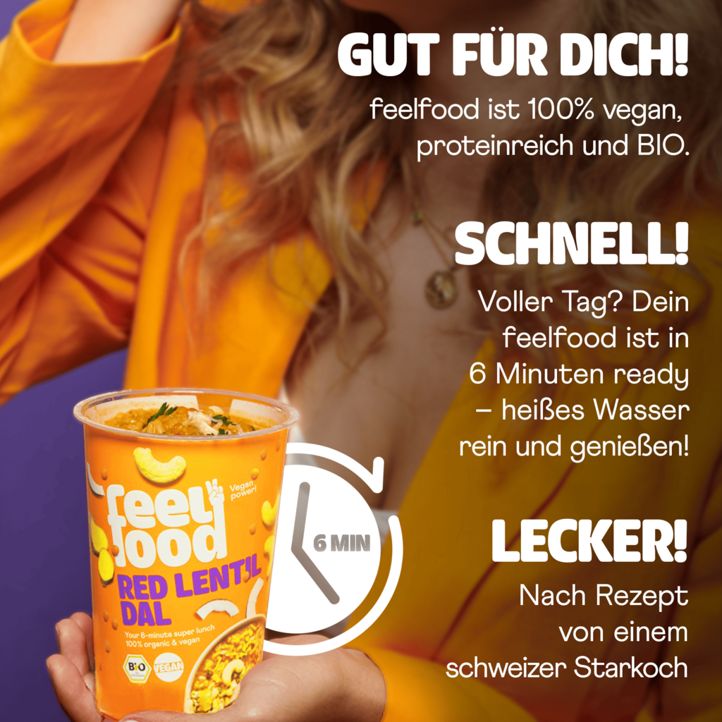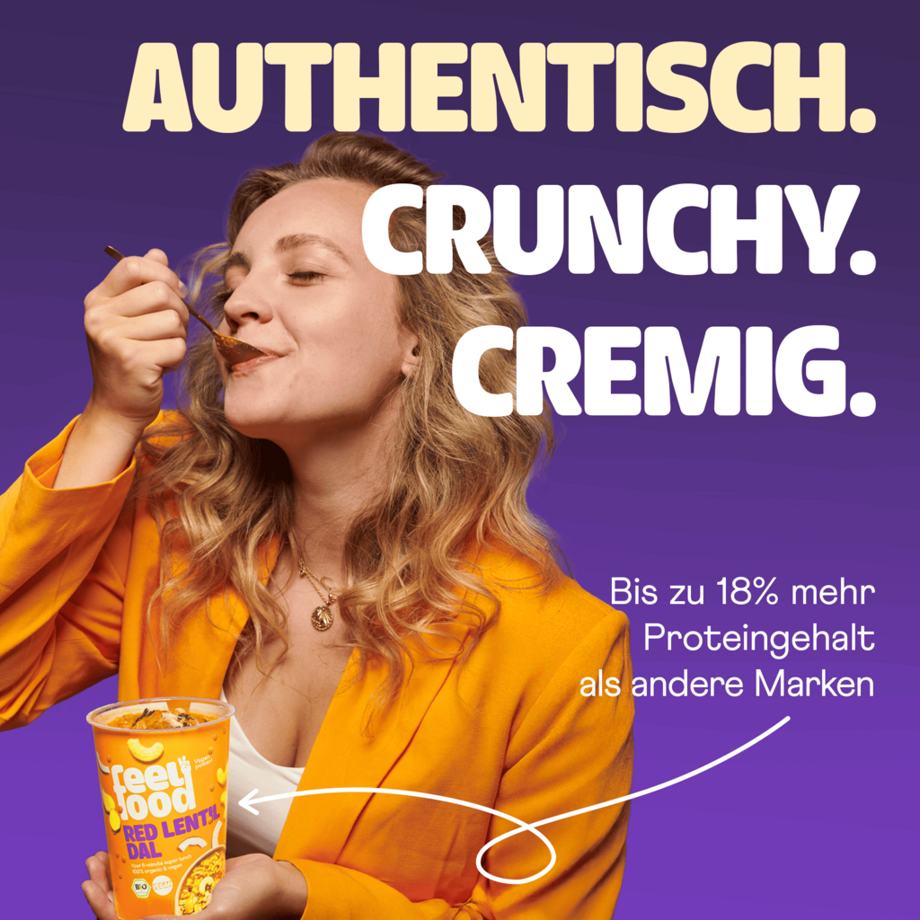 Doch hier der Clou – statt stundenlanges Köcheln bekommst du mit feelfood® Red Lentil Dal das Beste in Bio-Qualität und instant! Eine Extraportion rote Linsen mit cremiger Kokosmilch, Tomaten, Reis, aromatischen Gewürzen und geröstetem Cashew-Crunch. Ein Super Lunch, der selbst hartgesottene Linsen-Nein-Sager*innen überzeugt. Cremig, authentisch indisch und suuuper tasty!