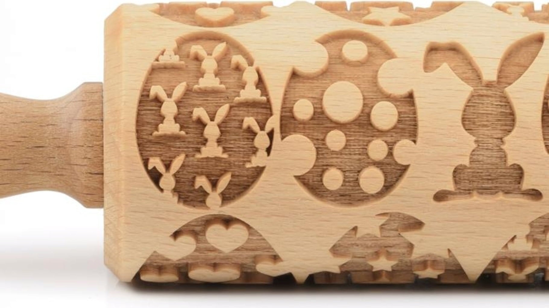 Entzückende Häschen und zahlreiche Ostereier zieren diese aufwendig gravierte Motivteigrolle aus hochwertigem Buchenholz. Perfekt für kleine Köstlichkeiten zu Ostern, denn so einfach war das Backen von dekorativ verzierten Plätzchen noch nie: Über den ausgerollten Teig rollen und anschließend nach Herzenslust mit Teigrädchen und Ausstechern in Form bringen, backen, fertig!