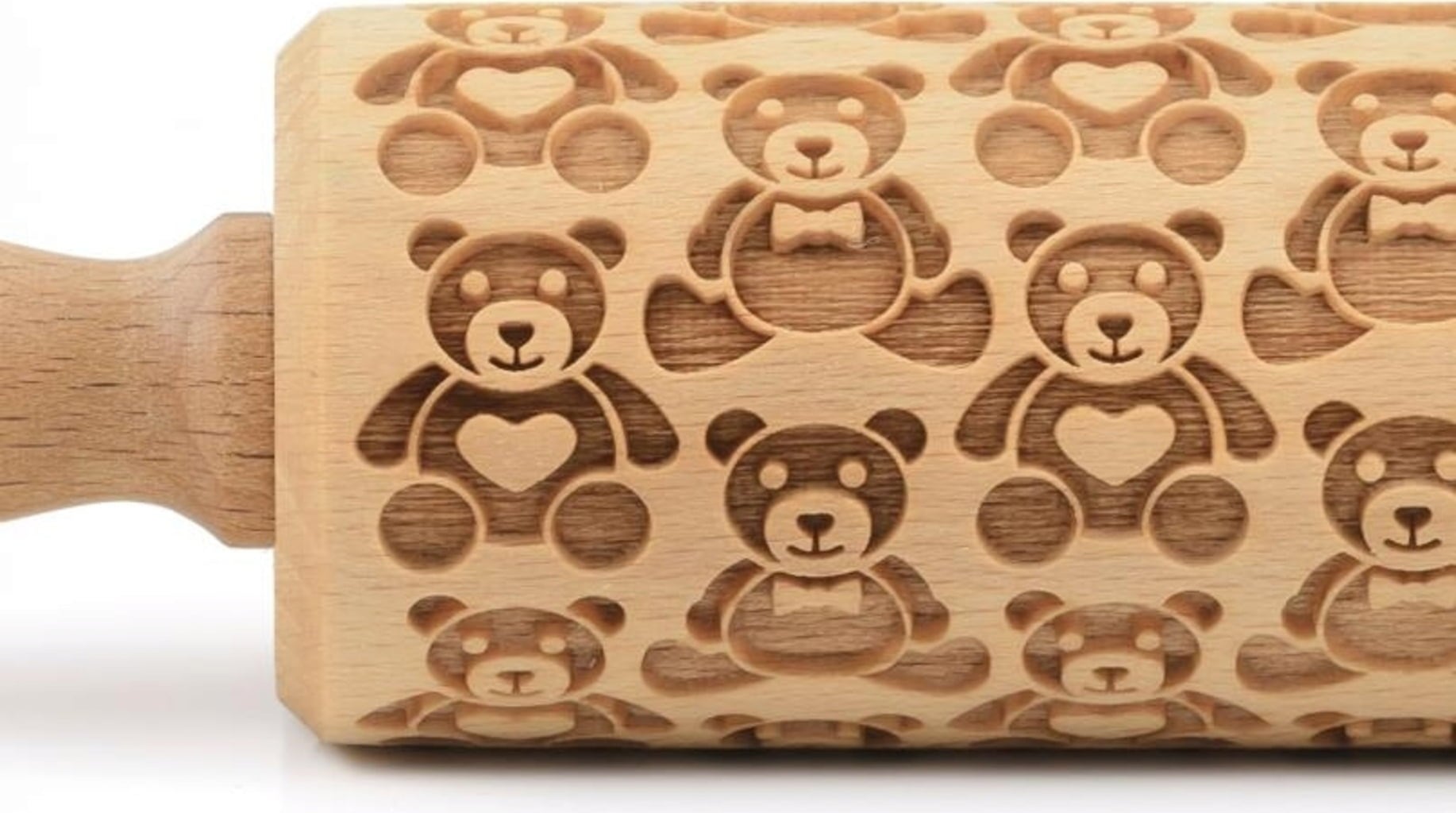 Unzählige süße Teddybären zieren diese aufwendig gravierte Motivteigrolle aus hochwertigem Buchenholz. Perfekt für kleine Naschkatzen, denn so einfach war das Backen von dekorativ verzierten Plätzchen noch nie: Über den ausgerollten Teig rollen und anschließend nach Herzenslust mit Teigrädchen und Ausstechern in Form bringen, backen, fertig!
