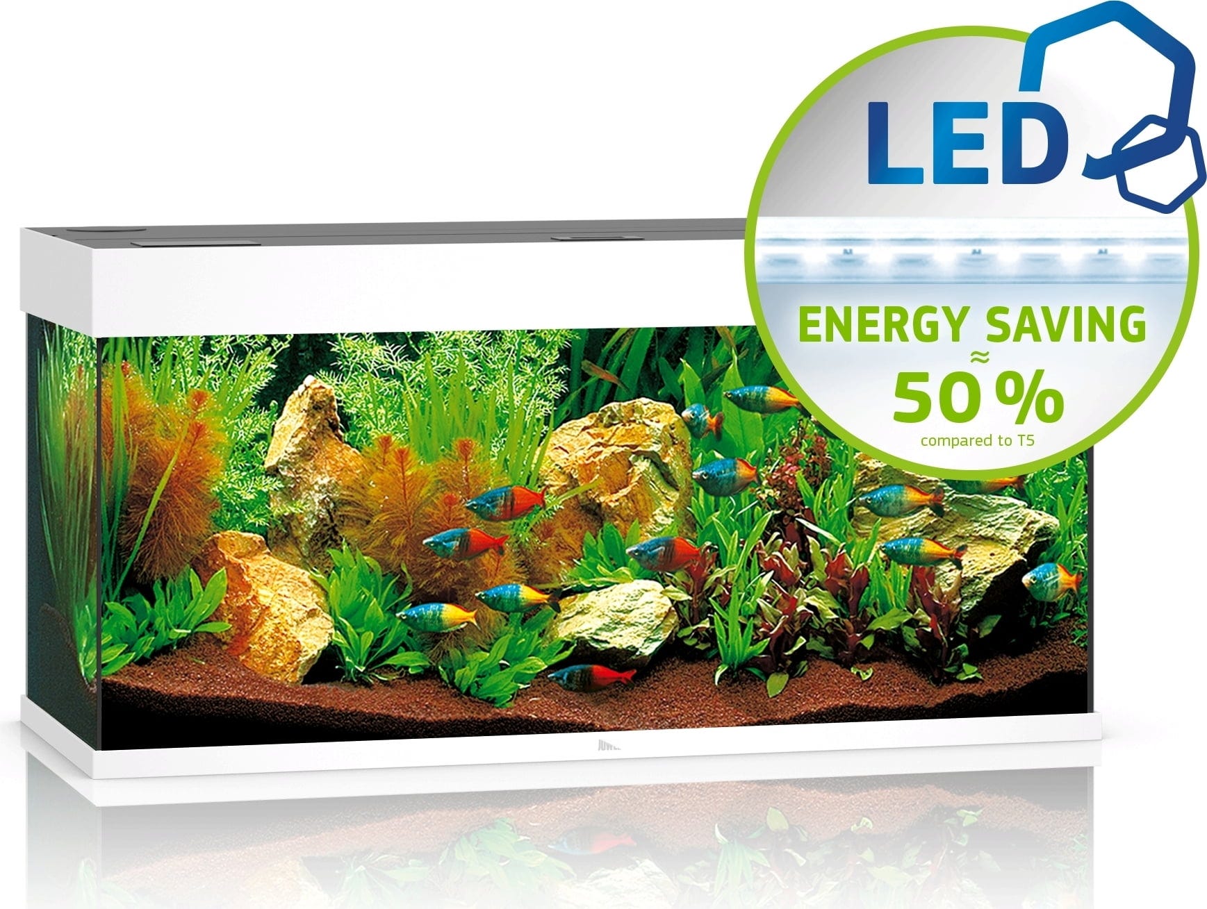 Eine brillante Ausleuchtung und hervorragendes Pflanzenwachstum bietet dir die moderne MultiLux LED-Beleuchtungsröhrentechnologie von JUWEL. Die auswechselbaren 17 Watt LED Röhren DAY und NATURE erzeugen ein optimales Lichtspektrum bei gleichzeitiger Energieersparnis von bis zu 50% im Vergleich zu T5 Röhren. Das MultiLux LED Beleuchtungssystem des RIO 180 LED ermöglicht dir das komfortable Arbeiten im Aquarium selbst bei eingeschalteter Beleuchtung. Die ultraschall-verschweißte Leuchteinheit ist 100%ig wasserdicht und erfüllt die hohen europäischen Sicherheitsstandards.