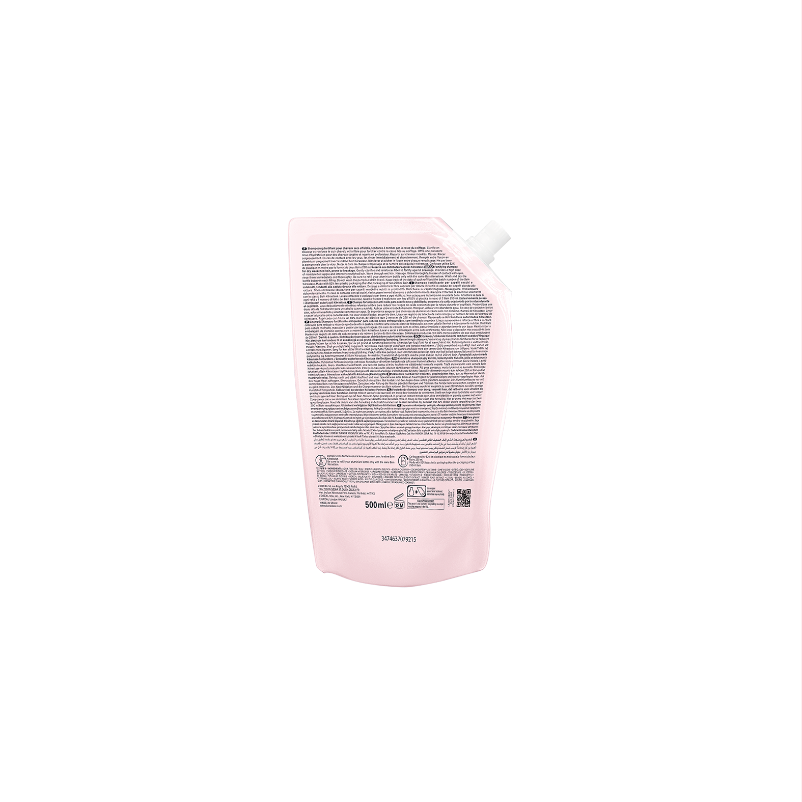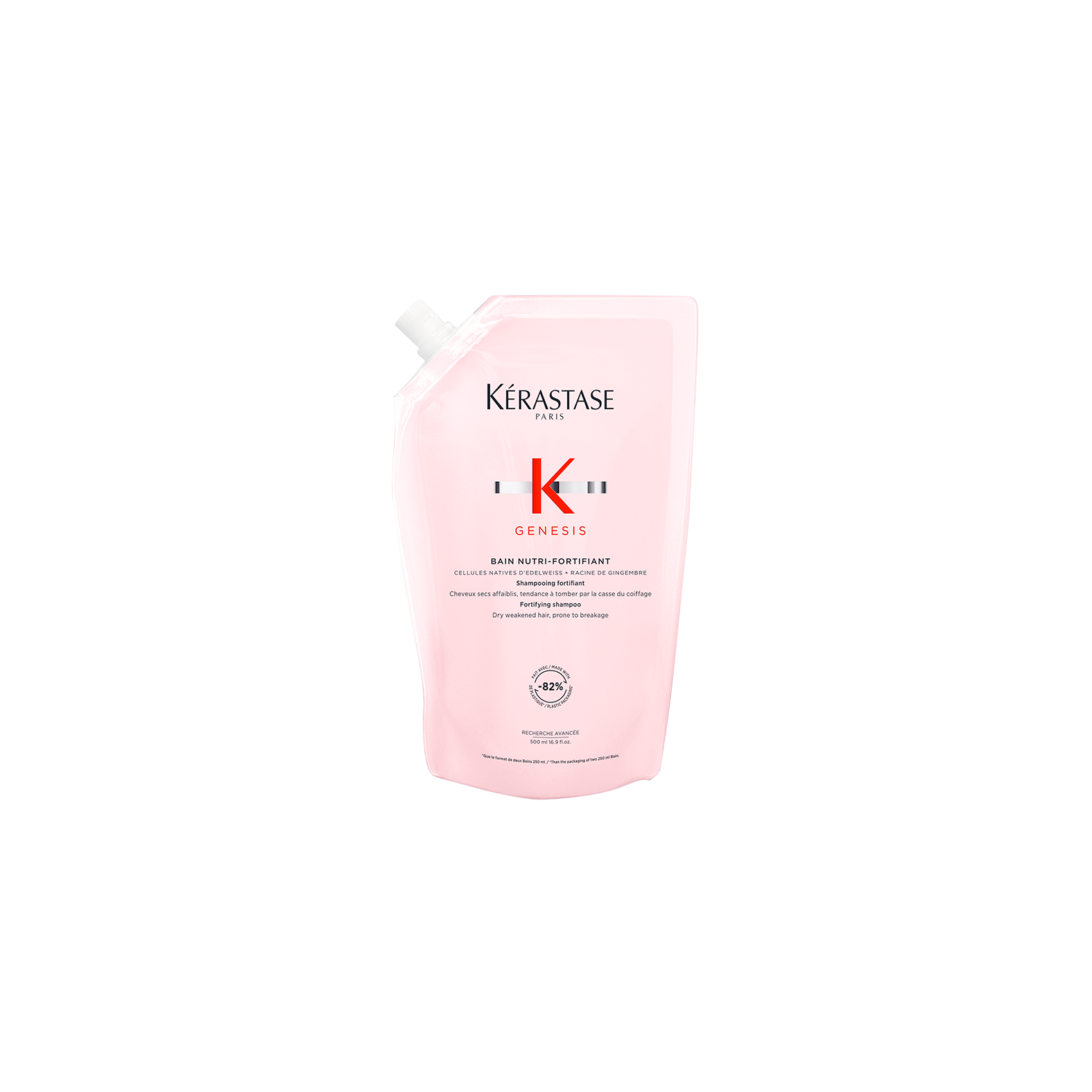 - Im Vergleich zu zwei 250ml Kérastase Shampoos wird für die Herstellung der Verpackung 82% weniger Kunststoff benötigt.
