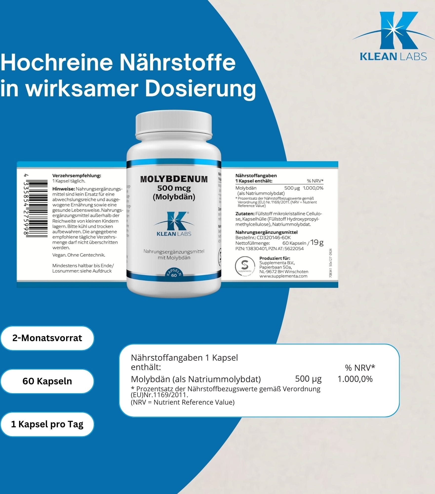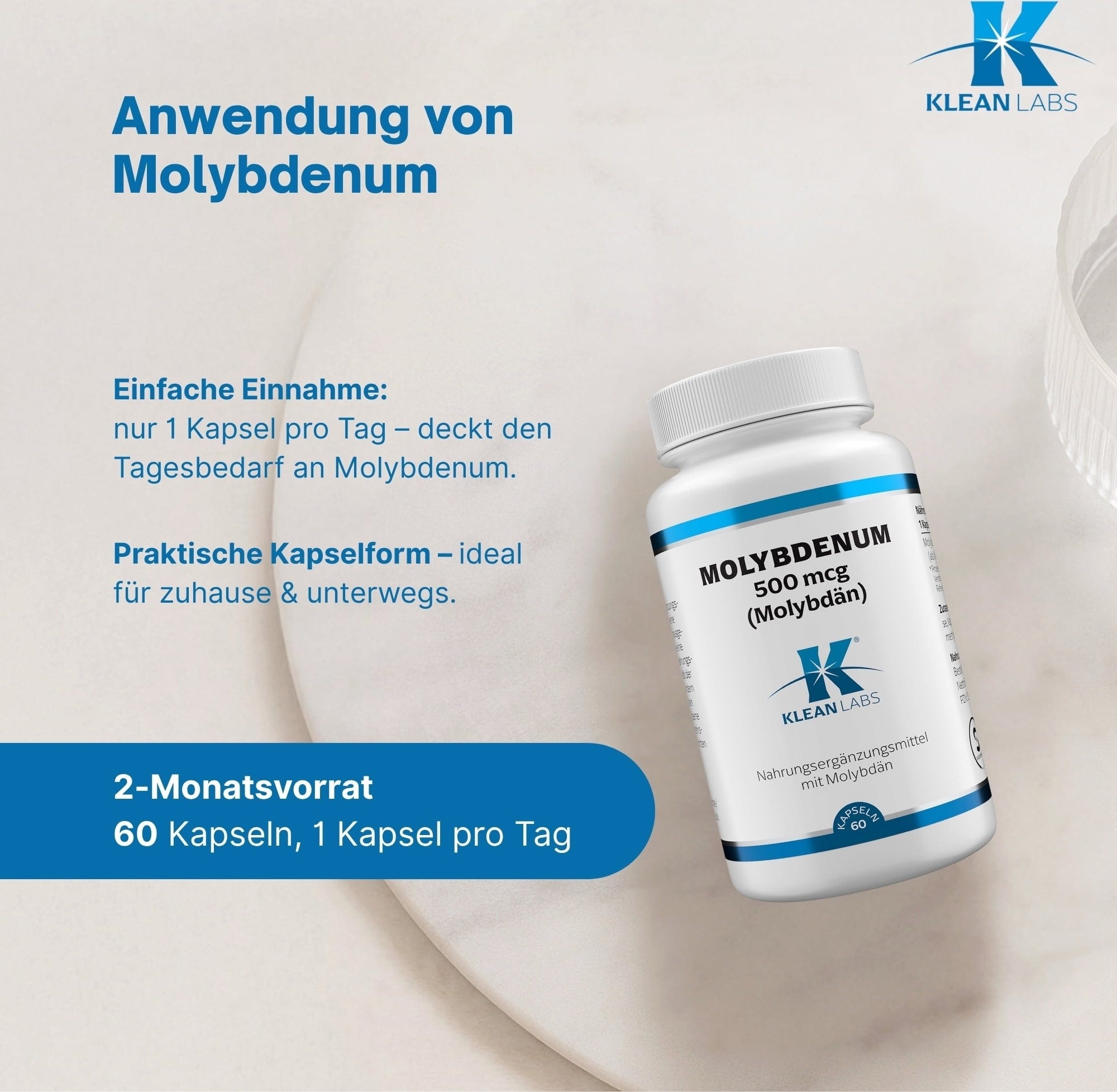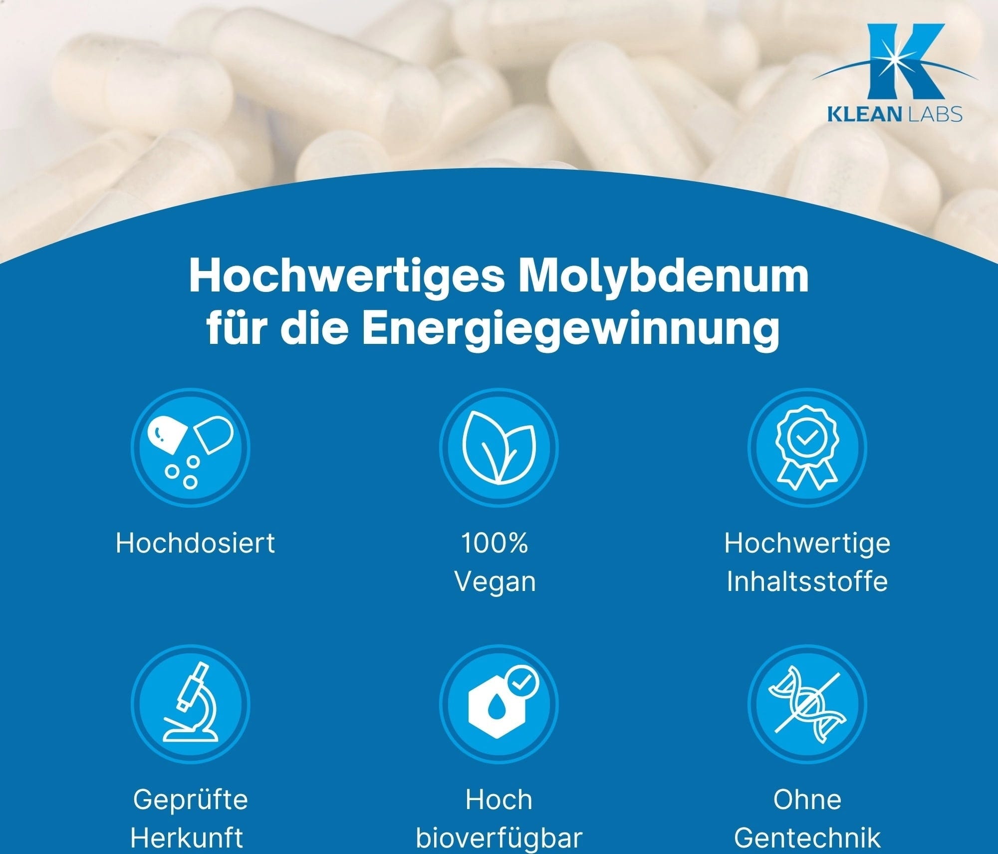 Molybdenum von Klean Labs enthält 500 µg Molybdän pro Kapsel. Das Nahrungsergänzungsmittel ist zudem 100 % vegan und frei von Gentechnik.