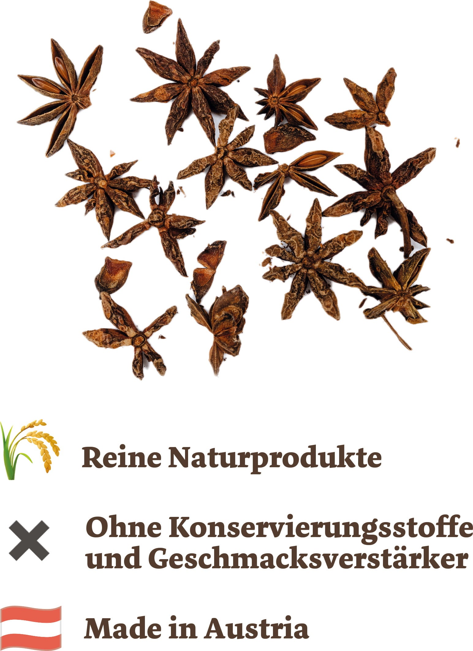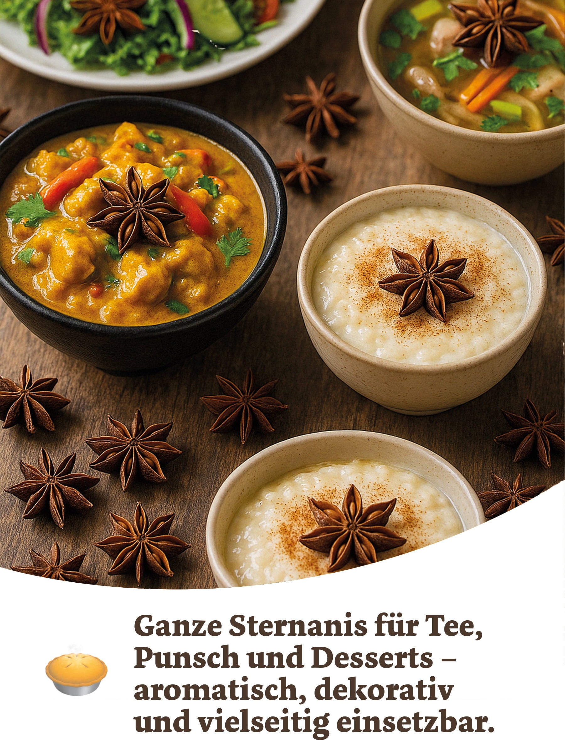 Sternanis ist hervorragend geeignet für süße und auch pikante Gerichte. Besondern beliebt ist er in der Weihnachtszeit. Egal ob Fleisch- und Fischgerichte, Suppen, Saucen oder auch Fruchtaufstriche, Tee, Desserts, Kompotte. Sternanis verleiht jedem Gericht das gewisse Etwas.