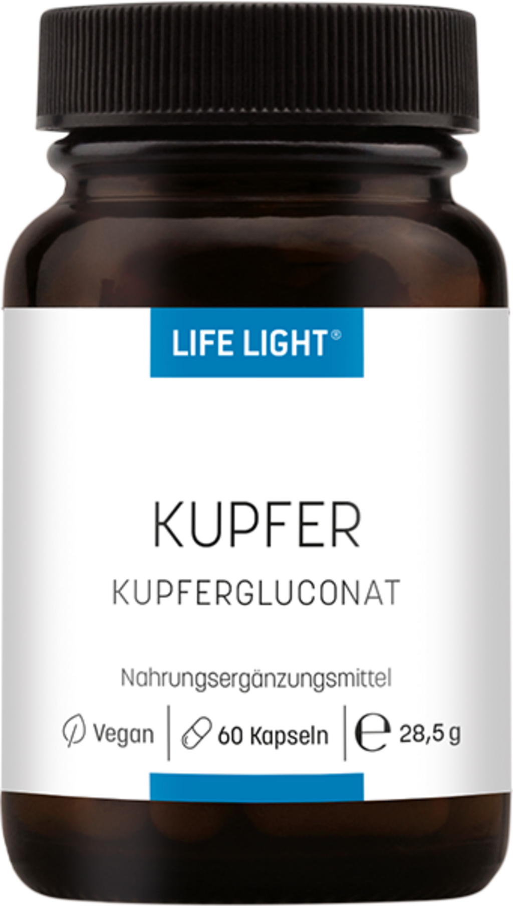 Kupfer ist ein essentielles Spurenelement, das unter anderem zu einem normalen Energiestoffwechsel und zur normalen Funktion des Nervensystems bzw. Immunsystems beiträgt. Life Light® Kupfer enthält organisch gebundenes Kupfergluconat. Das Produkt ist frei von künstlichen Zusatzstoffen, für Vegetarier und Veganer geeignet und eine wertvolle Ergänzung einer ausgewogenen Ernährung.