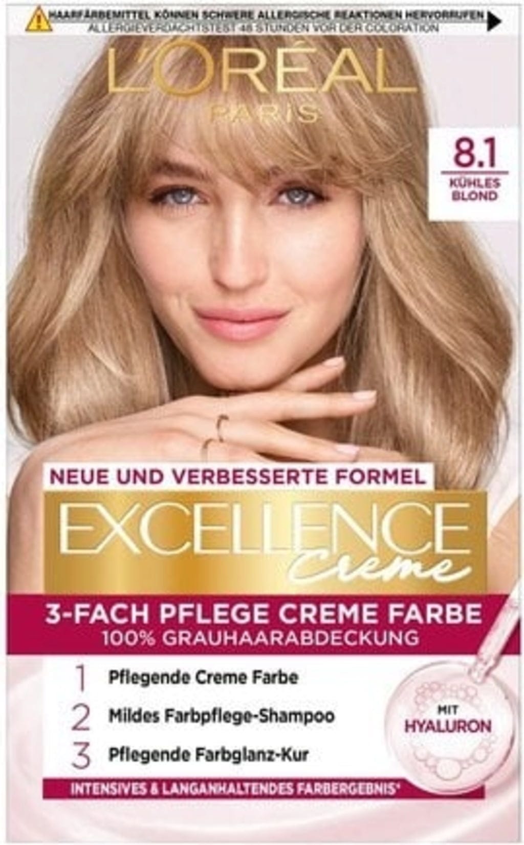 EXCELLENCE Crème 8.1 Kühles Blond lässt deine Haare nicht nur in einem Kühlen Blond erstrahlen und deckt graue Haare zu 100% ab. Die Creme Farbe pflegt auch 3-fach: