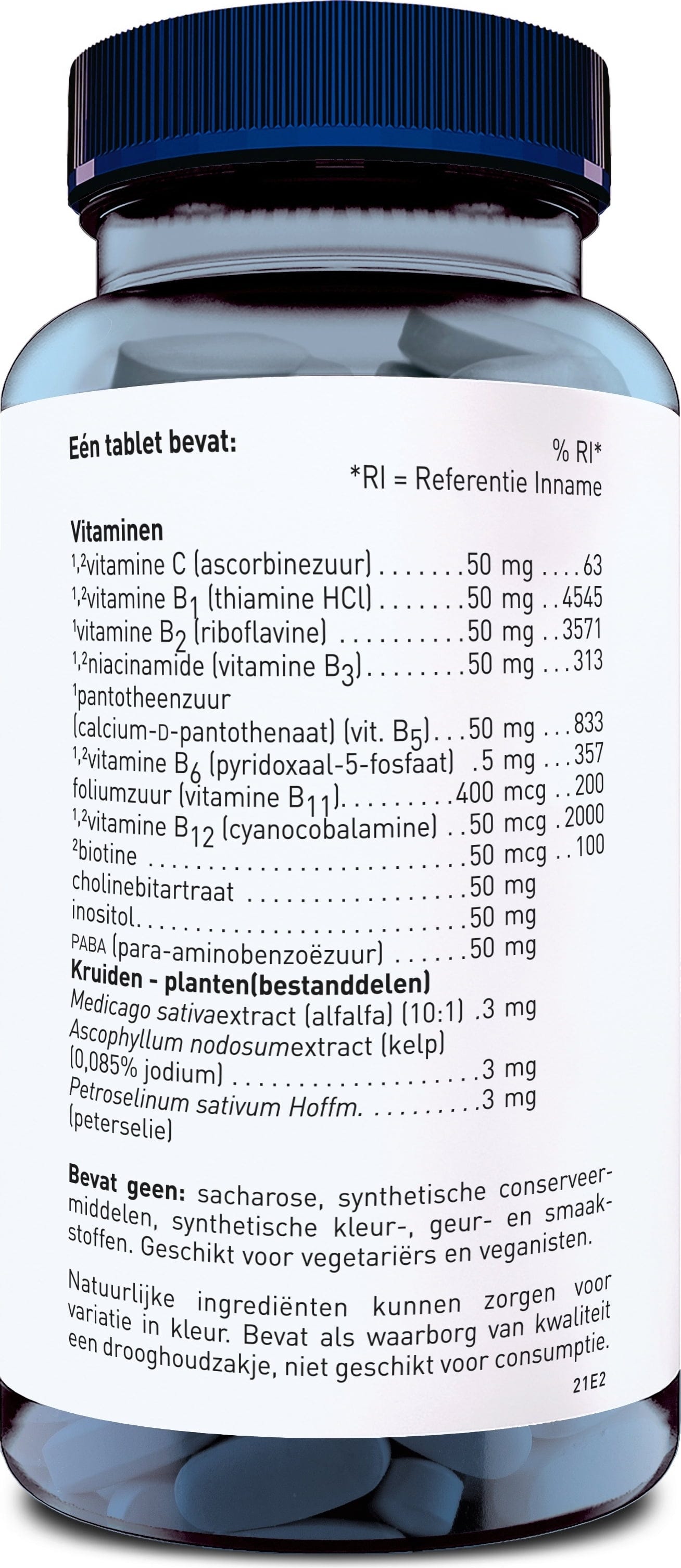 Füllstoff (Calciumphosphate), L-Ascorbinsäure, Vitamin B5 (Calcium-D-Pantothenat), Niacinamid, Riboflavin, Thiaminhydrochlorid, Para-Aminobenzoesäure (PABA), Inositol, Cholinbitartrat, mikrokristalline Cellulose, Füllstoff (Hydroxypropylcellulose), Füllstoff (Natriumcarboxymethylcellulose), Trennmittel (Speisefettsäuren, Magnesiumsalze von Speisefettsäuren, Siliciumdioxid), Überzugsmittel (Hydroxypropylmethylcellulose), Feuchthaltemittel (Glycerin), Pyridoxinhydrochlorid, Überzugsmittel (Carnaubawachs), Petersilie, Kelp, Folsäure, Biotin, Cyanocobalamin