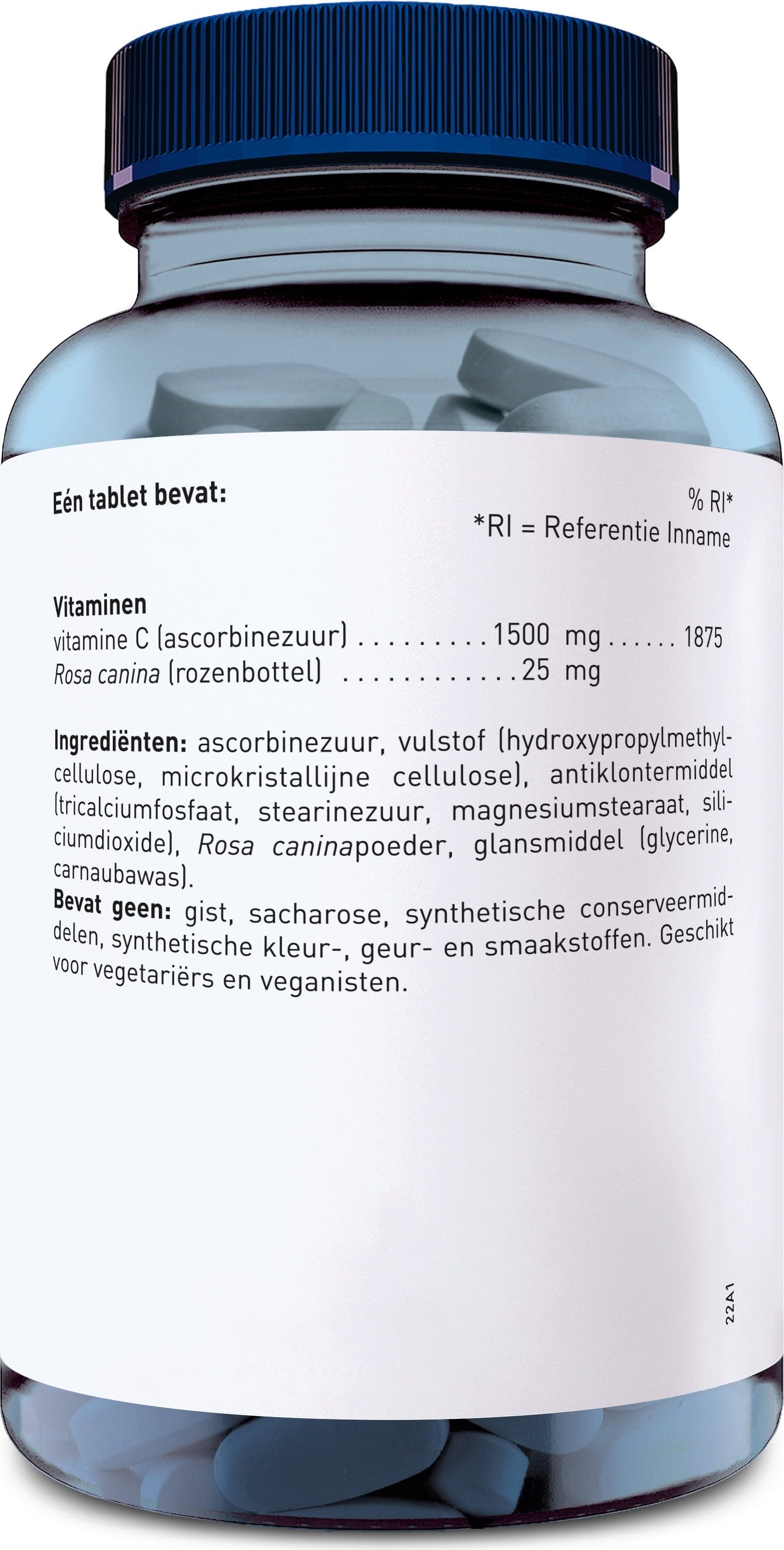 L-Ascorbinsäure, Füllstoff (Hydroxypropylmethylcellulose, Mikrokristalline Cellulose), Trennmittel (Calciumphosphate, Tricalciumphosphat), Hagebutten-Extrakt, Trennmittel (Speisefettsäuren, Magnesiumsalze von Speisefettsäuren, Siliciumdioxid), Überzugsmittel (Glycerin), Überzugsmittel (Carnaubawachs)