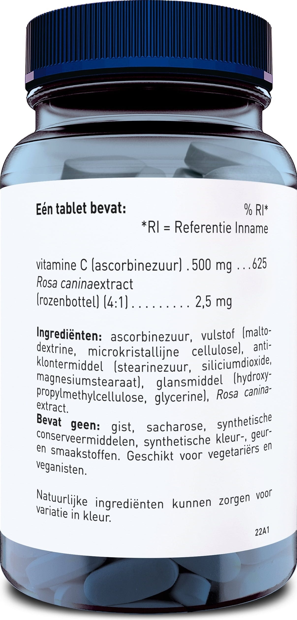 L-Ascorbinsäure, Füllstoff (Maltodextrin, Mikrokristalline Cellulose), Trennmittel (Speisefettsäuren, Siliciumdioxid, Magnesiumsalze von Speisefettsäuren), Überzugsmittel (Hydroxypropylmethylcellulose, Glycerin), Hagebutten-Extrakt