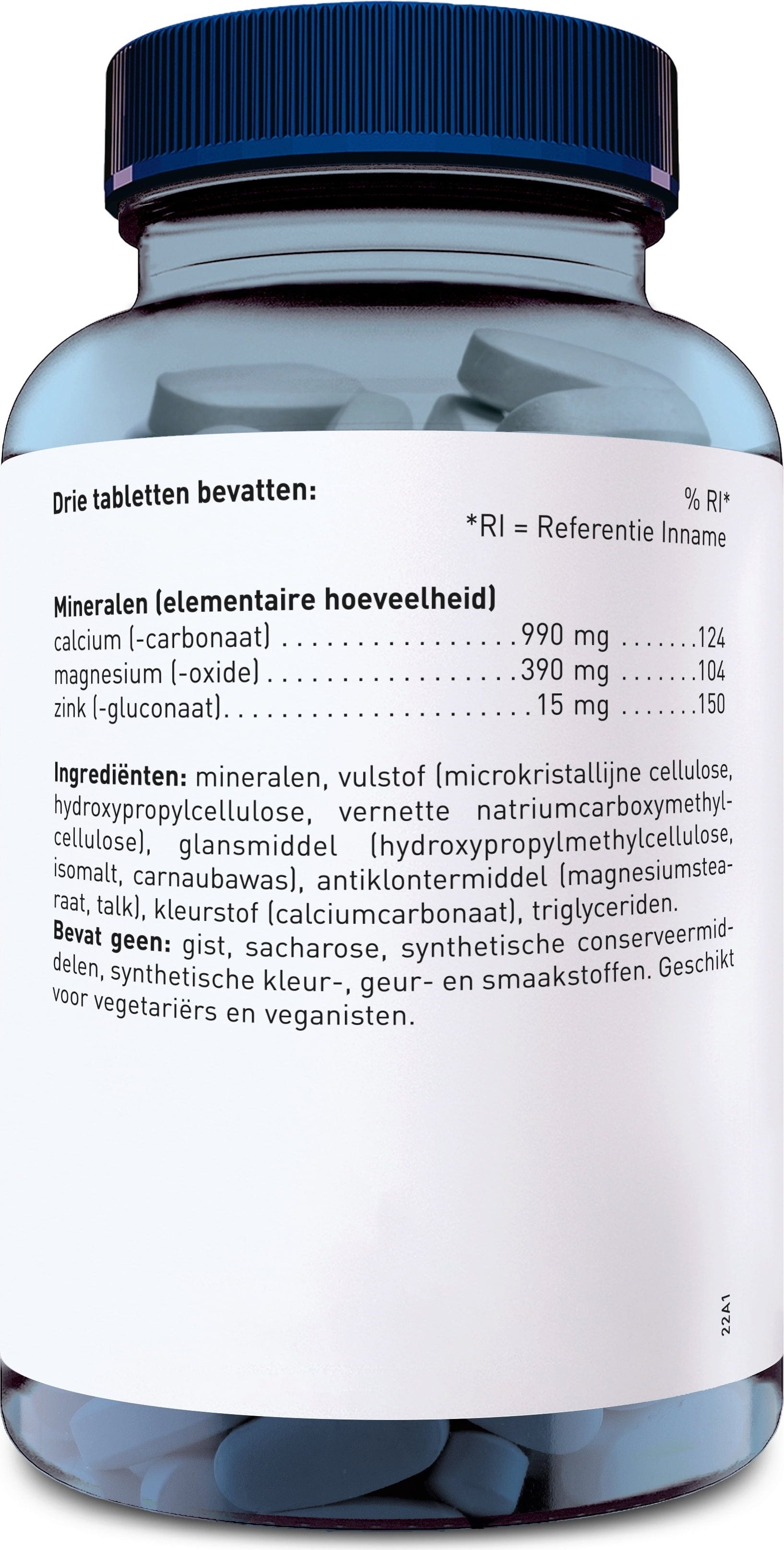 Calciumcarbonat, Magnesium (als Oxid), Füllstoff (Mikrokristalline Cellulose, Hydroxypropylcellulose, Natriumcarboxymethylcellulose), Zinkgluconat, Überzugsmittel (Hydroxypropylmethylcellulose, Isomalt, Carnaubawachs), Trennmittel (Magnesiumsalze von Speisefettsäuren, Talkum), Farbstoff (Calciumcarbonat, Trigylceride)