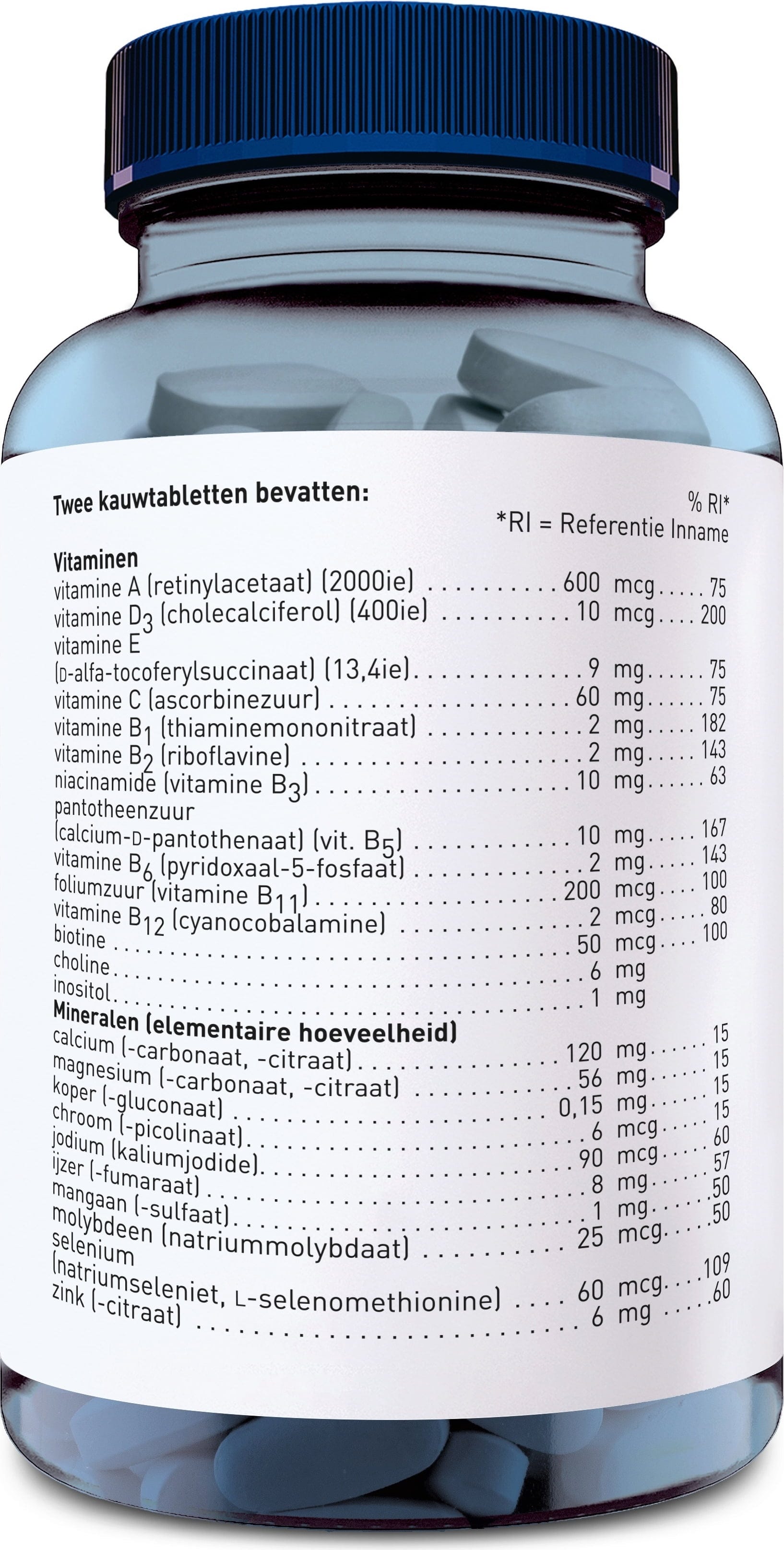 Calcium (Calciumcarbonat, Calciumcitrat), Süßungsmittel (Dextrose), Magnesium (Magnesiumcarbonat, Magnesiumcitrat), L-Ascorbinsäure, Zinkcitrat, Farbstoff (Rote Bete Pulver), Süßungsmittel (Xylit), Trennmittel (Speisefettsäuren, Siliciumdioxid, Magnesiumsalze von Speisefettsäuren), Geschmacksstoffe (Himbeeraroma), Niacinamid, Vitamin B5 (Calciumpantothenat), Säuerungsmittel (Citronensäure), Vitamin E (d-alpha-Tocopherol), Eisenfumarat, Cholinbitartrat, Mangansulfat, Riboflavin, Thiaminmononitrat, Pyridoxal-5-Phosphat, Kupfergluconat, Inositol, Vitamin A (Retinylacetat), Folsäure, Natriumselenat (Selen) (Natriumselenit, L-Selenomethionin), Kaliumjodid, Natriummolybdat, Biotin, Vitamin D3 (Cholecalciferol), Chrompicolinat, Cyanocobalamin