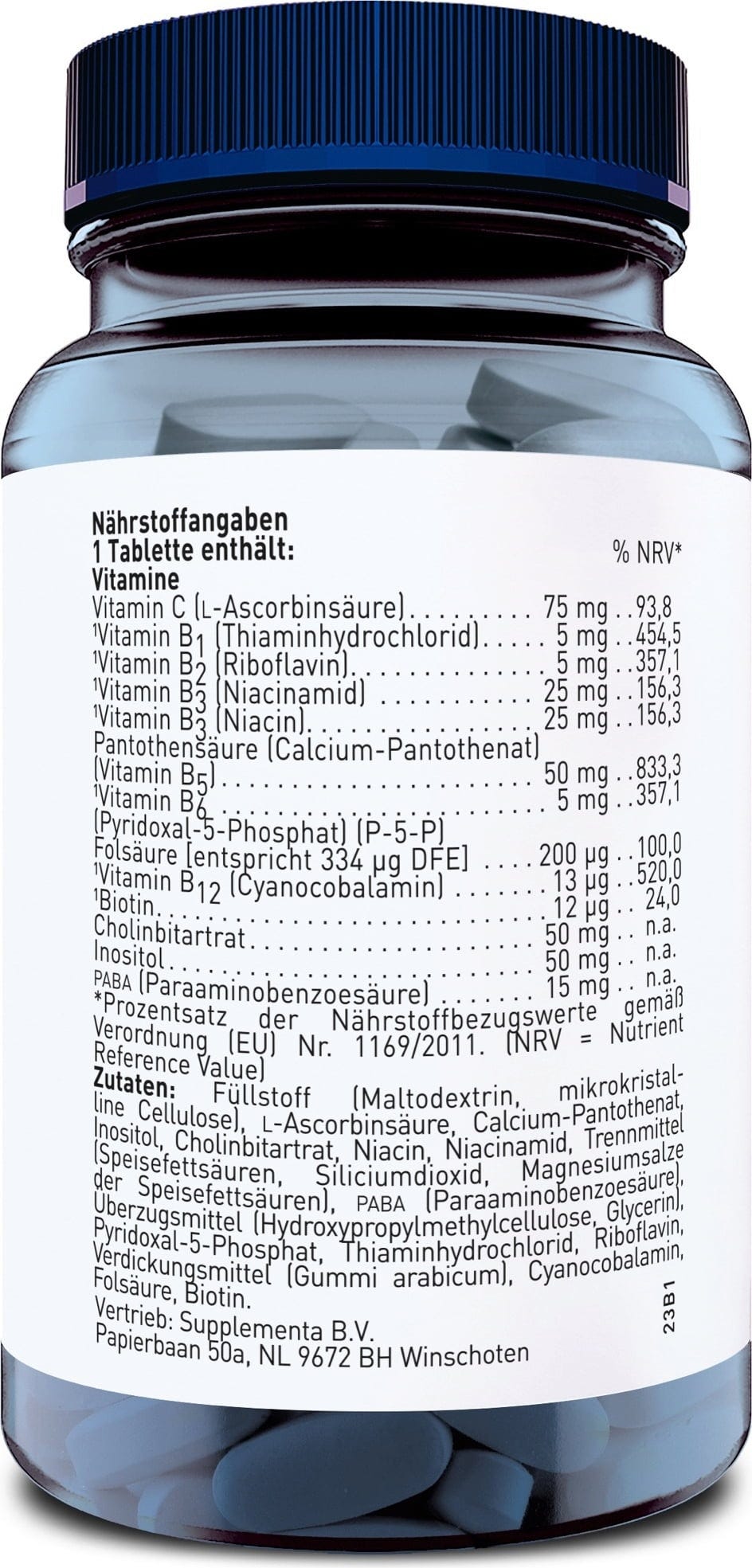 Füllstoff (Maltodextrin, Mikrokristalline Cellulose), L-Ascorbinsäure, Vitamin B5 (Calcium-D-Pantothenat), Inositol, Cholinbitartrat, Niacin, Niacinamid, Trennmittel (Speisefettsäuren, Siliciumdioxid, Magnesiumsalze von Speisefettsäuren), Para-Aminobenzoesäure (PABA), Überzugsmittel (Hydroxypropylmethylcellulose, Glycerin), Pyridoxal-5-Phosphat, Thiaminhydrochlorid, Riboflavin, Verdickungsmittel (Gummi Arabicum), Cyanocobalamin, Folsäure, Biotin