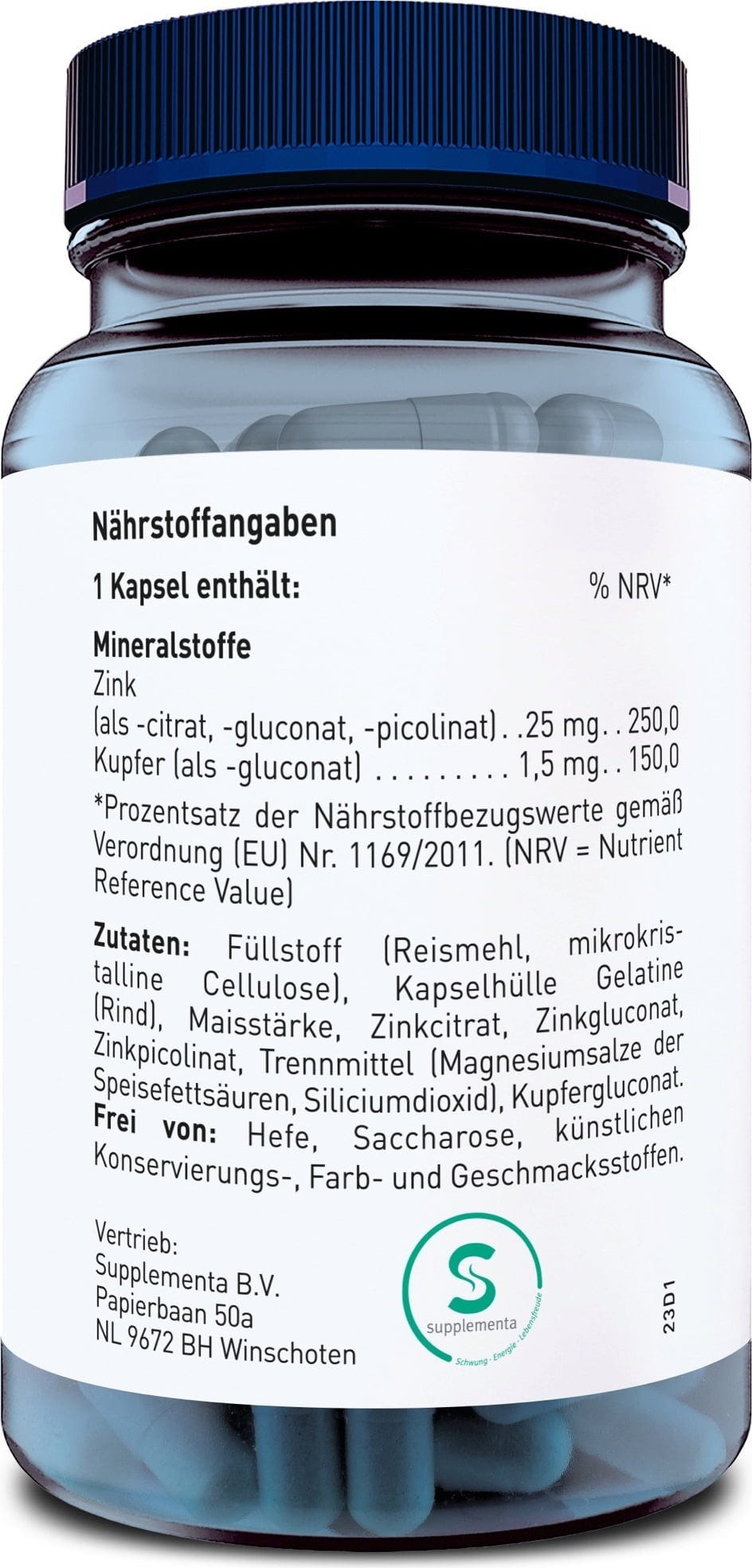 Füllstoff (Reismehl, Mikrokristalline Cellulose), Kapselhülle (Hydroxypropylmethylcellulose), Maisstärke, Zinkcitrat, Zinkgluconat, Zinkpicolinat, Trennmittel (Magnesiumsalze von Speisefettsäuren, Siliciumdioxid), Kupfergluconat
