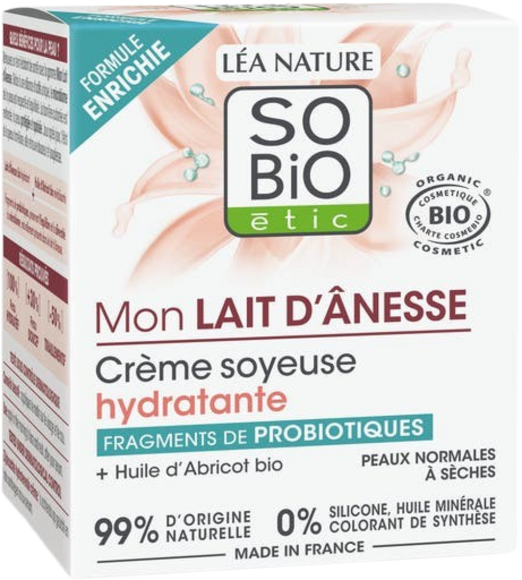 Mit dieser seidigen Feuchtigkeitscreme aus Eselsmilch hat LÉA NATURE SO BiO étic ein einzigartiges Produkt geschaffen. Die weiche Textur dieser Creme schmilzt zart auf der Haut und bildet einen köstlich duftenden Schutzfilm. Sie versorgt die Haut mit Feuchtigkeit, schützt sie und pflegt sie samtig weich.