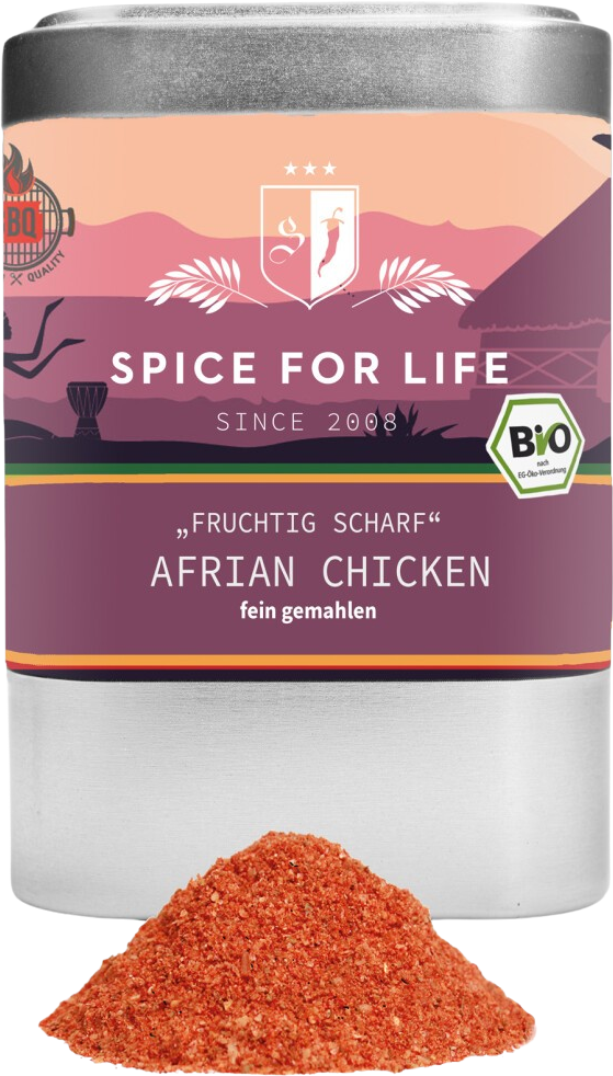 Fruchtige Mango, feuriger Cayennepfeffer, süße Kokosflocken - ein spannendes Geschmackserlebnis, das gegrillten, gebratenen und gebackenen Geflügelgerichten eine ganz neue Seite verleiht! Verwende die Spice for Live Bio African Chicken Gewürzmischung direkt zum Würzen deines Hühnchens oder für aromatische Marinaden. Als Gewürz für die knusprige Panierung verwendet, verleiht es dem Sonntags-Backhenderl ein exotisches Aromenfeuerwerk!