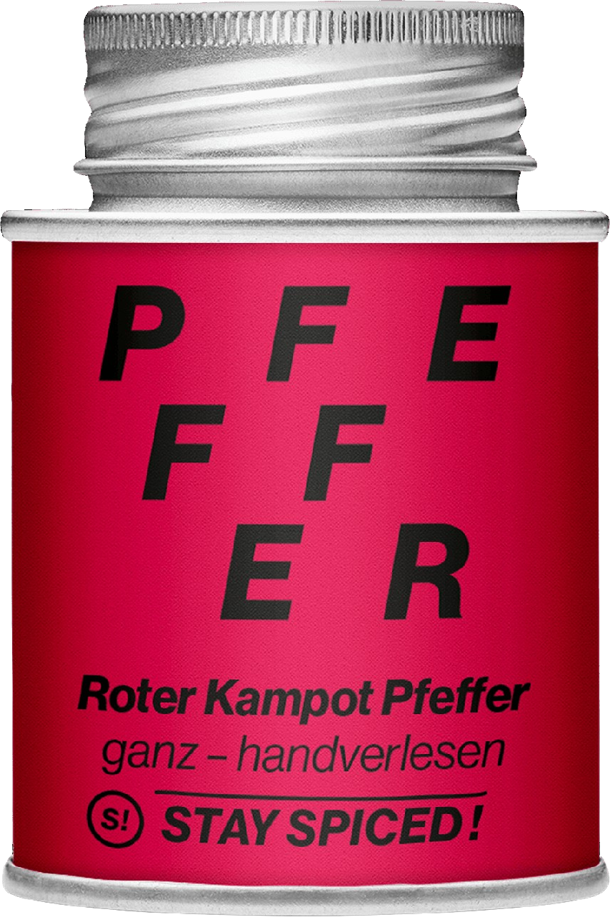 Der echte - also nicht eingefärbte - rote Pfeffer aus Kambodscha gilt gleichzeitig als eine der besten und eine der seltensten Pfeffersorten weltweit. Die Pfefferkörner für den Roten Kampot Pfeffer von Stay Spiced! werden händisch einzeln gepflückt, in der Sonne getrocknet und dann handverlesen. Nur die allerbeste Qualität darf in die die Aromadosen.