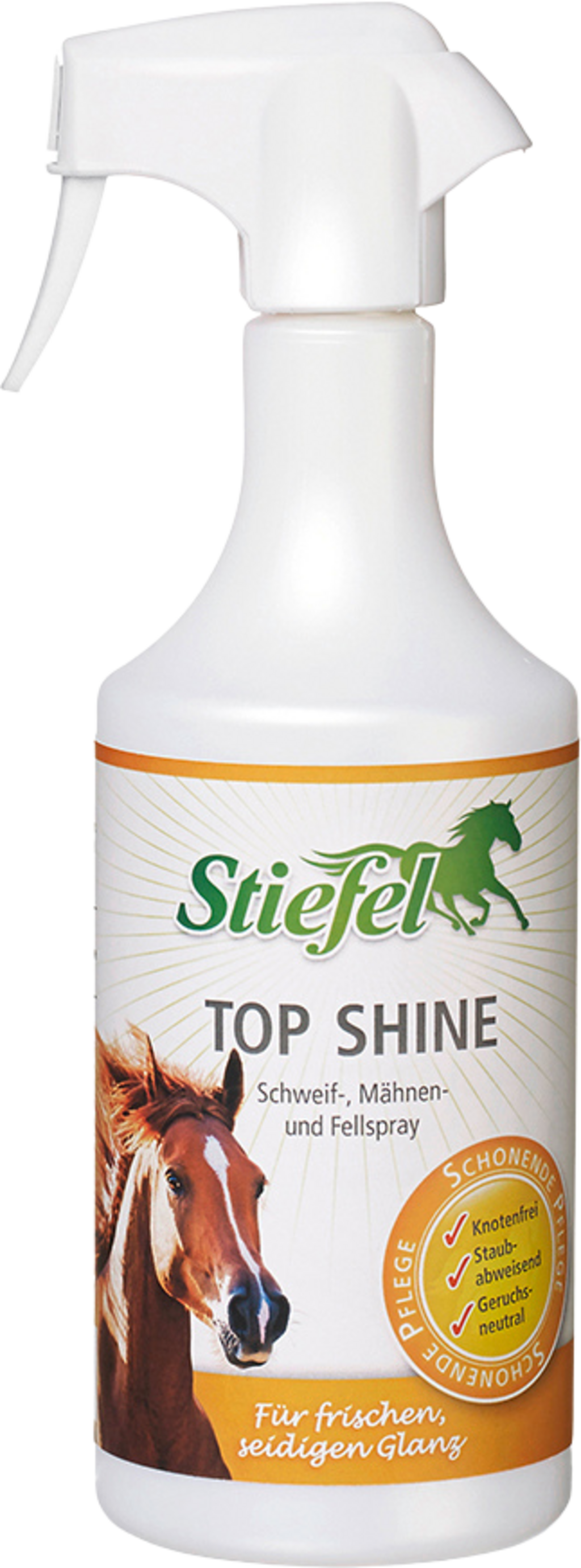 Stiefel Top Shine ist die hochwertige Pflege für Fell, Mähne und Schweif des Pferdes. Mähne und Schweif lassen sich leichter bürsten und von Knoten befreien. Das Fell wird schonend gepflegt und erhält einen seidigen Glanz. Der unsichtbare Schutzfilm, der Haare und Fell umgibt, kann staubabweisend wirken und eine erneuten Knotenbildung verhindern.