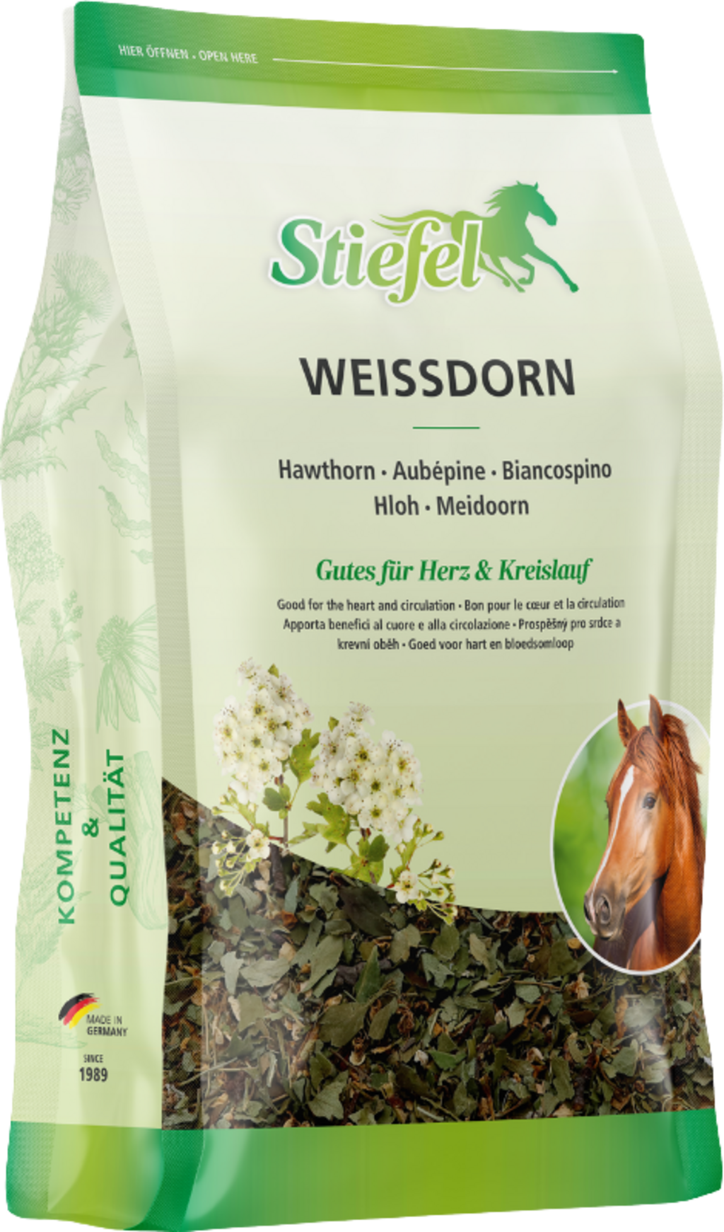 Stiefel Weißdorn kann zur Unterstützung von Herz und Kreislauf des Pferdes eingesetzt werden. Stiefel Weißdorn kann die Sauerstoff- und Nährstoffzufuhr des Herzens steigern und sich positiv auf den Blutdruck sowie Herzrhythmus auswirken. Damit ist Stiefel Weißdorn optimal für ältere Pferde und für Sportpferde zur Leistungssteigerung geeignet.