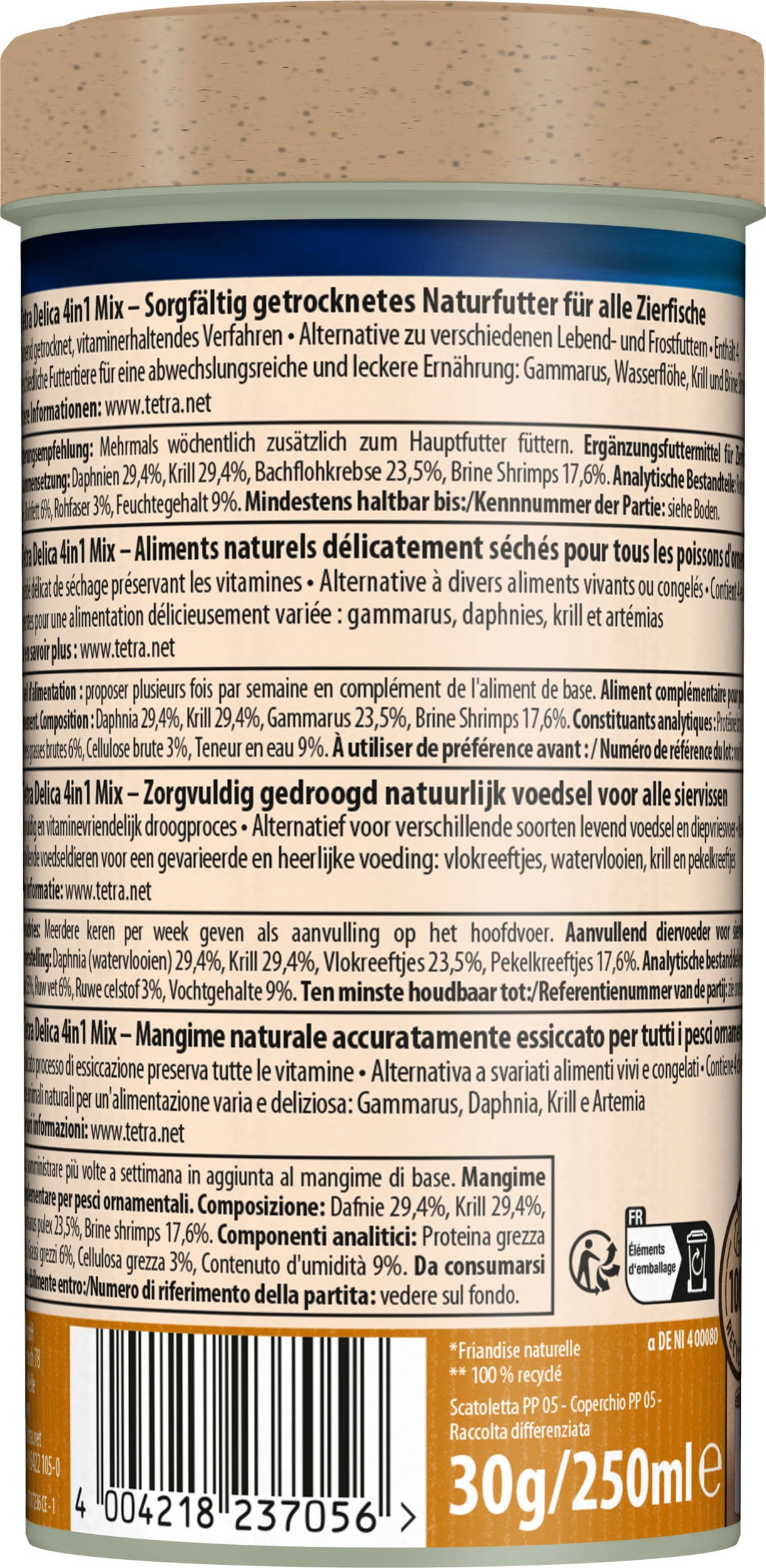 Der Tetra Delica Mix ist ein hochwertiges Ergänzungsfutter in vier separaten Fächern und besteht aus: 29% Wasserflöhe, 18% Artemia, 29% Krill, 24% Gammarus. Dieser Mix ist die perfekte Ergänzung zum Tetra Hauptfutter und sorgt für eine abwechslungsreiche und artgerechte Fütterung. Das sorgfältig gefrier-, bzw. sonnengetrocknete Naturfutter sorgt für einen optimalen Nährwert und zeichnet sich durch Qualität aus. Gammarus sind eine natürliche Quelle an Carotinoiden zur Verstärkung der Farbenpracht der Fische und enthalten einen Protein-Gehalt von ca. 45%. Krill verfügt über essentielle Omega-3-Fettsäuren, die für ein gesundes Wachstum sorgen, der Proteingehalt liegt hier bei 65%. Wasserflöhe sind eine ideale Quelle für natürliche Ballaststoffe zur Verdauungsförderung, sowie einem hohen Mineralienanteil, der Protein-Gehalt liegt bei ca. 35%. Artemia verfügen über einen hohen Gehalt an Nährstoffen, sowie Carotinoiden zur natürlichen Verstärkung der Farbenpracht der Fische auf und haben einen Protein-Gehalt von ca. 45%.