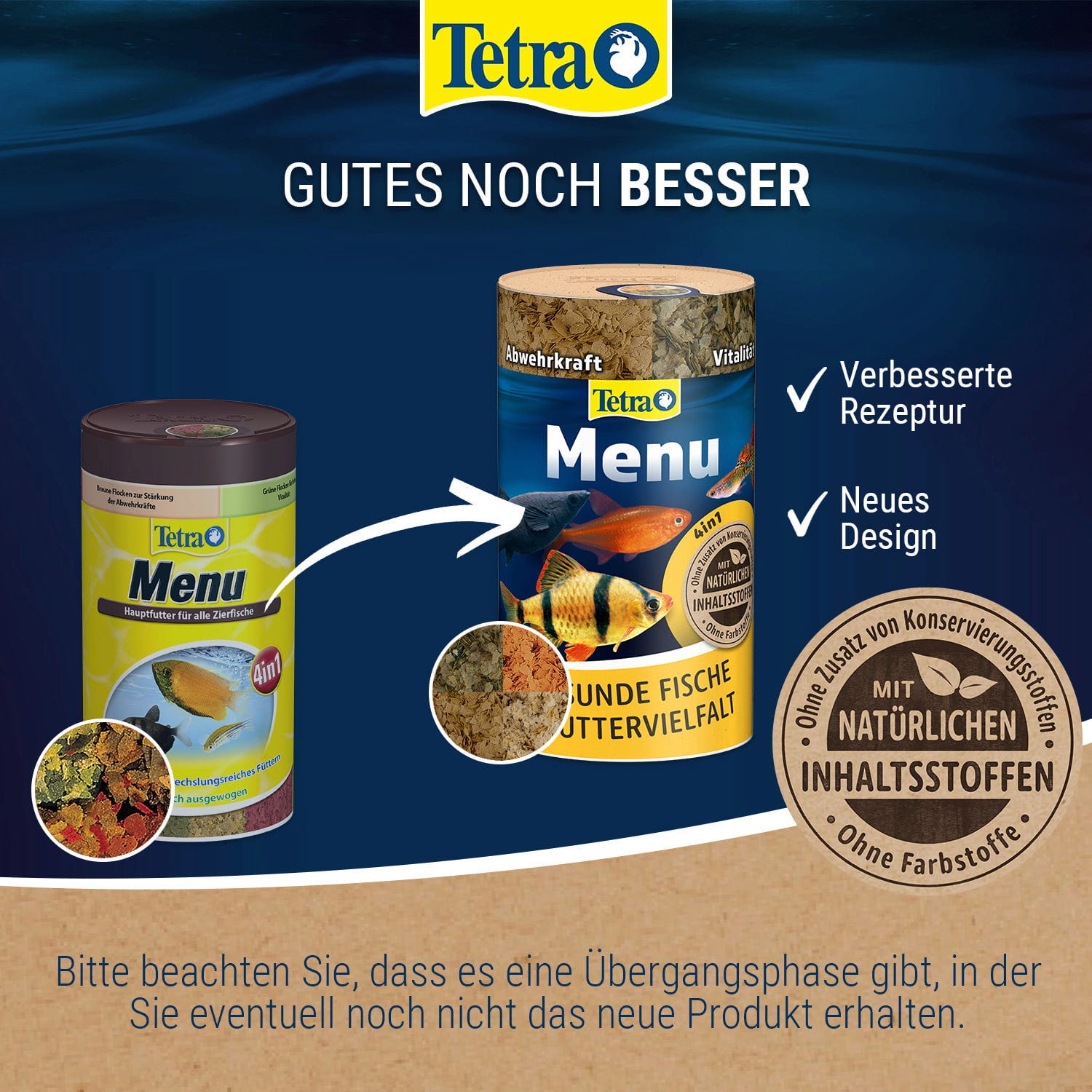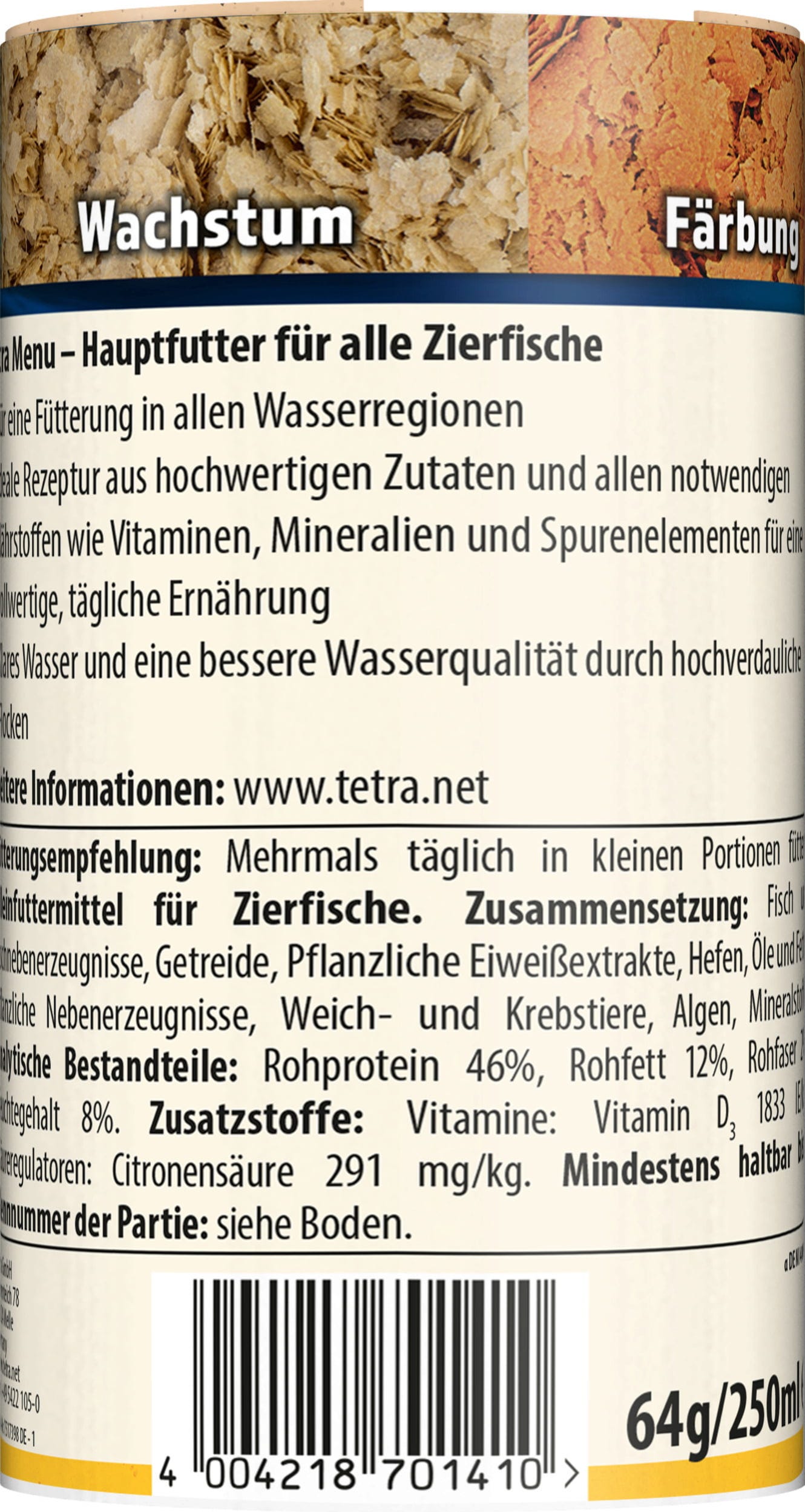 Tetra Menu ist ein Hauptfutter für alle Zierfische im Süßwasseraquarium und besteht aus 4 verschiedenen Spezialflocken. Die sorgfältig ausgesuchten Flocken mit Vitaminen, Mineralien und Spurenelementen sorgen für eine abwechslungsreiche und ausgewogene Ernährung. Rote Flocken sorgen mit natürlichen Farbverstärkern für eine Steigerung der Farbenpracht. Braune Flocken enthalten eine spezielle Vitaminkombination zur Steigerung der Abwehrkräfte. Grüne Flocken bieten pflanzliche Vitalstoffe für eine hohe Vitalität und gelbe Flocken überzeugen mit einem optimierten Protein-Fett-Verhältnis für ein gesundes Wachstum. Die Flocken weisen allesamt eine hohe Akzeptanz bei allen Zierfischen auf, sodass die Fütterung zum Erlebnis wird. Das Futter kann gelegentlich mit Leckerbissen, wie z. B. den Tetra FreshDelica Sorten ergänzt werden.