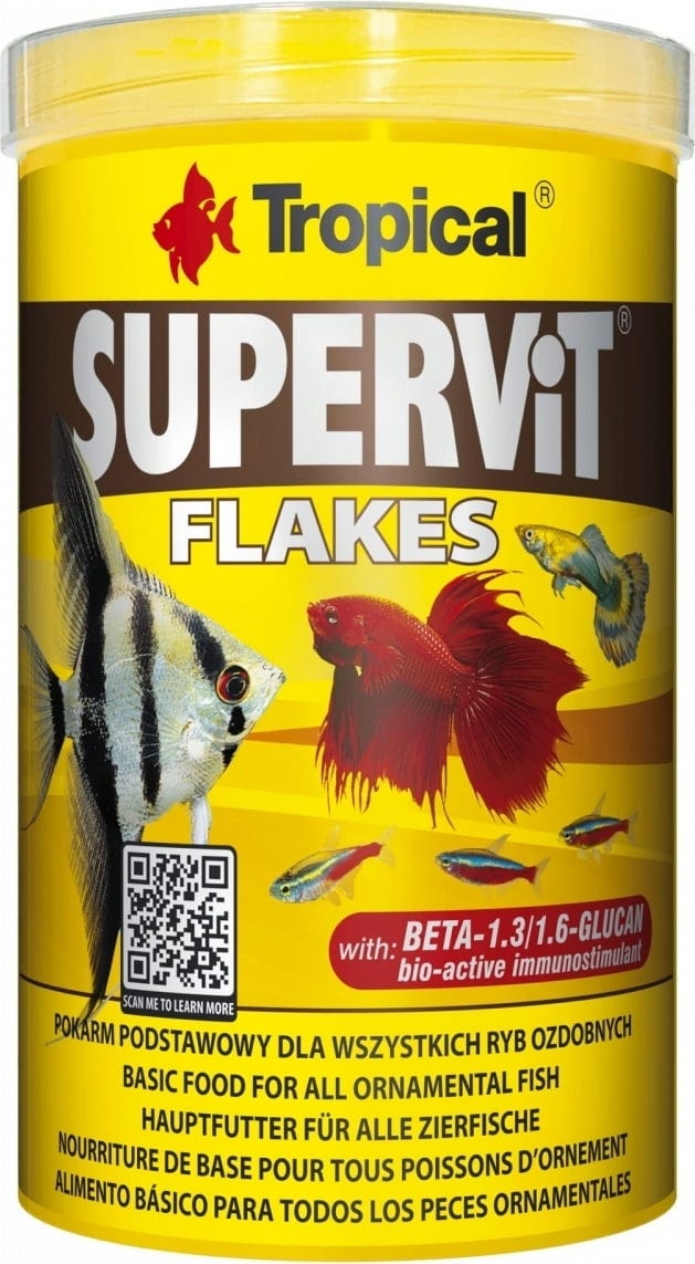 Supervit Flakes ist ein zutatenreiches Alleinfutter von Spitzenqualität in Flockenform zur täglichen Fütterung aller Aquariumfische. Es besteht aus Inhaltsstoffen, die den unterschiedlichen Ernährungsbedürfnissen im Gesellschaftsaquarium gehaltener Fische entsprechen. Das Futter enthält das natürliche Immunstimulans Beta-1,3/1,6-Glucan und stabilisiertes Vitamin C, welches das Immunsystem der Fische unterstützen kann.