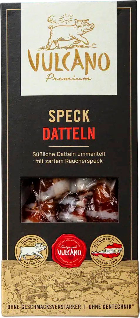 Getrocknete Datteln werden mit zartem, leicht geräuchertem Speck ummantelt. Diese Speckfrüchte eigenen sich sehr gut als kleine Jause zwischendurch, zum roh-essen aber auch cross gebraten zu Salaten, Chutneys oder allein als Vorspeise.