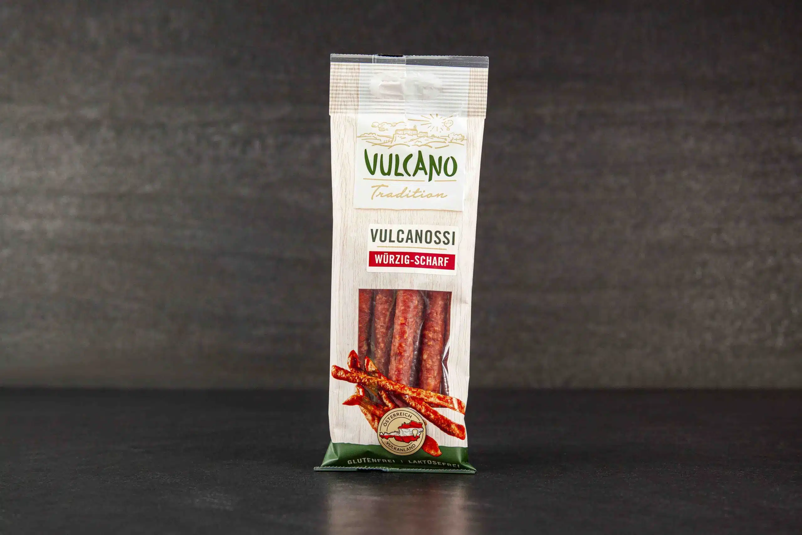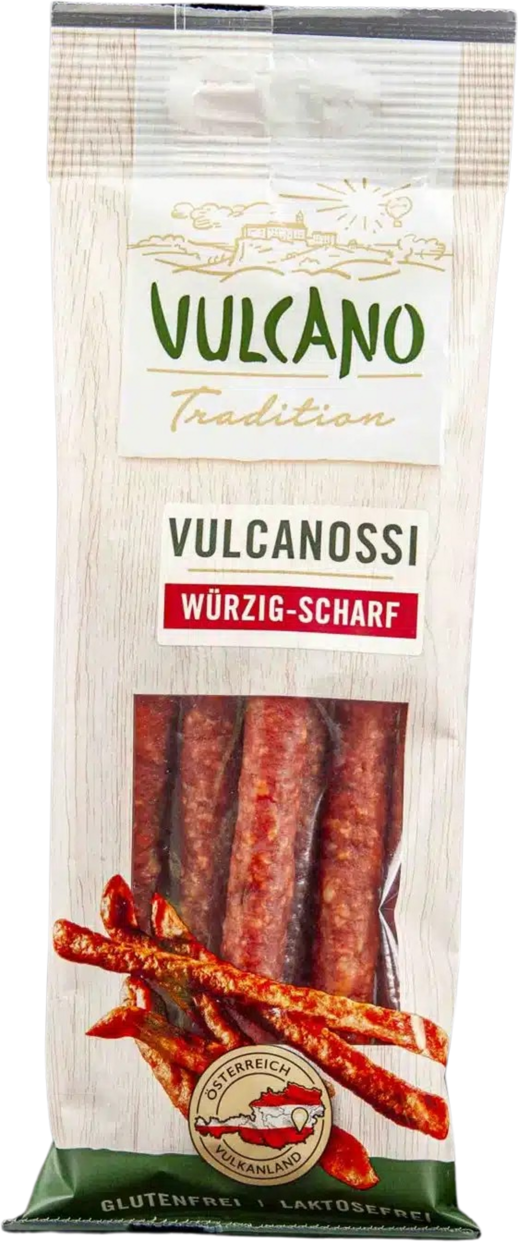 Die pikanten Vulcanossi werden aus bestem Schweinefleisch und Speck hergestellt. Die edlen Gewürze mit einem Hauch von Rauch sorgen für ein angenehm würziges Geschmackserlebnis.
